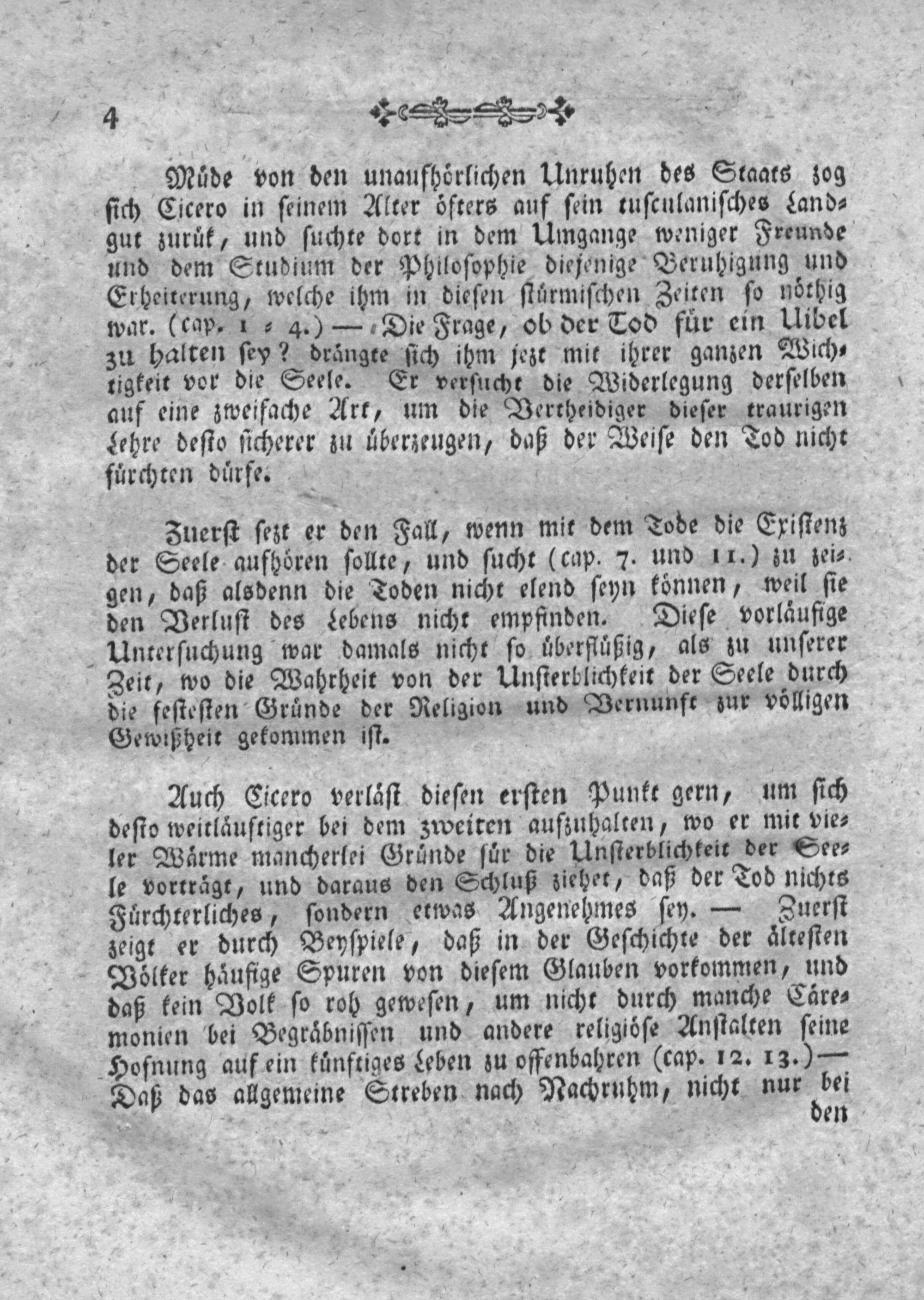 Muͤde von den unaufhörlichen Unruhen des Staats zog ſich Cicero in ſeinem Alter oͤfters auf ſein tuſculaniſches Land⸗ gut zuruͤk, und ſuchte dort in dem Umgange weniger Freunde und dem Studium der Philoſophie diejenige Beruhigung und Erheiterung, welche ihm in dieſen ſtuͤrmiſchen Zeiten ſo noͤthig war.(cap. 1⸗ 4.)— Die Frage, ob der Tod fuͤr ein Uibel zu halten ſey? draͤngte ſich ihm jezt mit ihrer ganzen Wich⸗ tigkeit vor die Seele. Er verſucht die Widerlegung derſelben auf eine zweifache Art, um die Vertheidiger dieſer traurigen Lehre deſto ſicherer zu uͤberzeugen, daß der Weiſe den Tod nicht fuͤrchten duͤrfe.