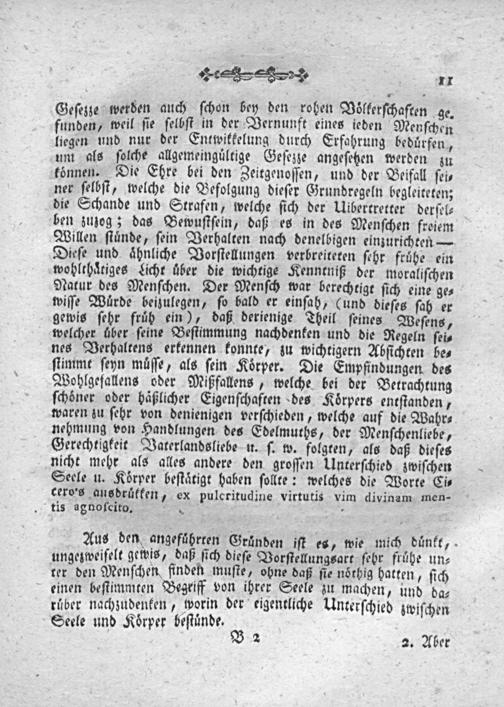 werden auch ſchon bey den rohen Voͤlkerſchaften ge. Grdn weil ſie ſelbſt in der Vernunft eines ieden Menſchon liegen und nur der Entwikkelung durch Erfahrung beduͤrfen, um als ſolche allgemeinguͤltige Geſezze angeſehen werden zu können. Die Ehre bei den Zeitgenoſſen, und der Beifall ſei⸗ ner ſelbſt, welche die Befolgung dieſer Grundregeln begleiteten; die Schande und Strafen, welche ſich der Ulibertretter derſel⸗ ben zuzog; das Bewuſtſein, daß es in des Menſchen freiem Willen ſtuͤnde, ſein Verhalten nach denelbigen einzurichten— Dieſe und aͤhnliche Vorſtellungen verbreiteten ſehr fruͤhe ein wohlthaͤtiges Licht uͤber die wichtige Kenntniß der moraliſchen Natur des Menſchen. Der Menſch war berecheigt ſich eine ge⸗ wiſſe Wuͤrde beizulegen, ſo bald er einſah,(und dieſes ſah er gewis ſehr fruͤh ein), daß derienige Theil ſeines Weſens, welcher uͤber ſeine Beſtimmung nachdenken und die Regeln ſei⸗ nes Verhaltens erkennen konnte, zu wichtigern Abſichten be⸗ ſtimmt ſeyn müͤſſe, als ſein Koͤrper. Die Empfindungen des Wohlgefallens oder Mißfallens, welche bei der Betrachtung ſchoͤner oder häßlicher Eigenſchaften des Koͤrpers entſtanden, waren zu ſehr von denienigen verſchieden, welche auf die Wahr⸗ nehmung von Handlungen des Edelmuths, der Menſchenliebe, Gerechtigkeit Vaterlandsliebe u. ſ. w. folgten, als daß dieſes nicht mehr als alles andere den groſſen Unterſchied zwiſchen Seele u. Koͤrper beſtaͤtigt haben ſollte: welches die Worte Ci⸗