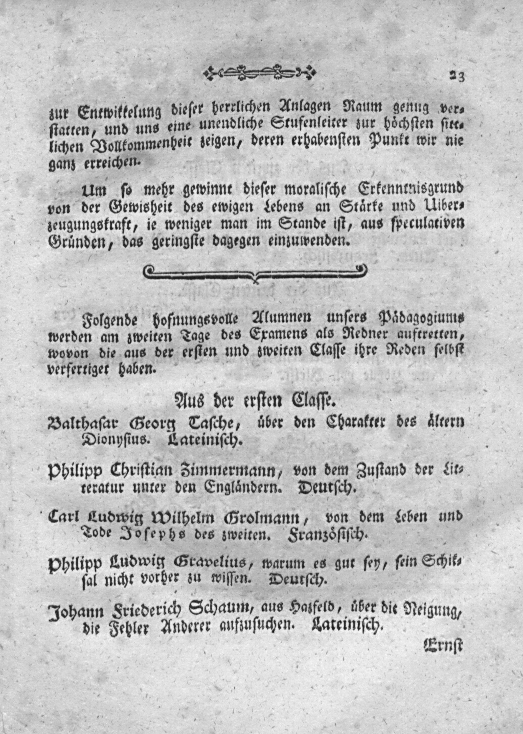 Folgende hofnungsvolle Alumnen unſers Päͤdagogiums werden am zweiten Tage des Examens als Redner auftretten, wovon die aus der erſten und zweiten Claſſe ihre Reden ſelbſt