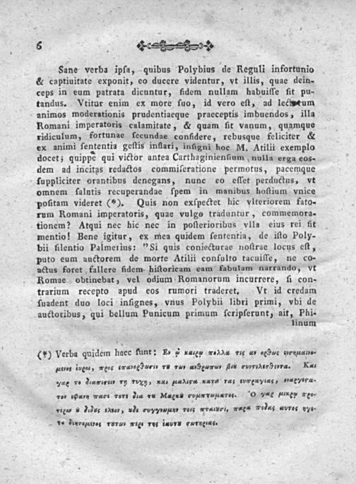 Sane verba ipſa, quibus Polybius de Reguli infortunio & captiuitate exponit, eo ducere videntur, vt illis, quae dein- ceps in eum patrata dicuntur, fidem nullam habuiſſe ſit pu- tandus. Vtitur enim ex more fuo, id vero eſt, ad lecwtum animos moderationis prudentiaeque praeceptis imbuendos, illa Romani imperatoris calamitate,& quam ſit vanum, quamque ridiculum, fortunae fecundae confidere, rebusque keliciter& ex animi ſententia geſtis inflari, inngni hoc M. Atilii exemplo docet; quippè qui victor antea Carthaginienfium nulla erga eos- dem ad incitas redactos commiſeratione permotus, pacemque fuppliciter orantibus denegans, nunc eo eſſet perductus, vt omnem falntis recuperandae ſpem in manibus hoſtium vnice poſitam videret(+). Quis non exſpectet hic vlteriorem fato- rum Romani imperatoris, quae vulgo traduntur, commemora- tionem? Atqui nec hic nec in poſterioribus vlla eius rei fit mentio! Bene igitur, ex mea quidem ſententia, de iſto Poly- bii filentio Palmerius:"Si quis coniecturae noſtrae locus eſt, puto eum auctorem de morte Atilii confulto tacuiſſe, ne co- actus foret fallere fidem hiſtoricam eam fabulam narrando, Vt Romae obtinebat, vel odium Romanorum incurrere, ſi con- trarium recepto apud eos rumori traderet. Vt id credam ſuadent duo loci inſignes, vnus Polybii libri primi, vbi de