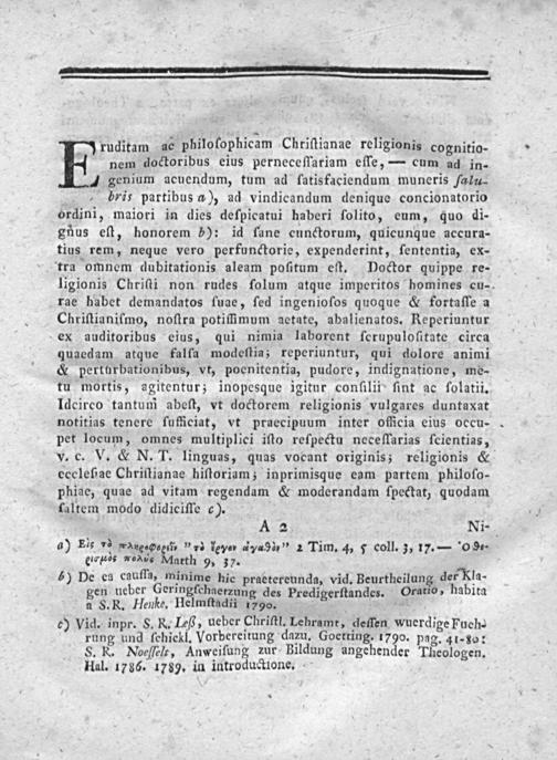 c) Vid. inpr. S. R. Ieſ, ueber Chriſtl. Lehramt, defen wuerdige Fueh- rung und ſchiekl. Vorbereitung dazu. Goetting. 1790. pag. 41-So: §. R. Noeſſelr, Anweiſung zur Bildung angehender Theologen. HHal. 1786. 1789. in introductione.