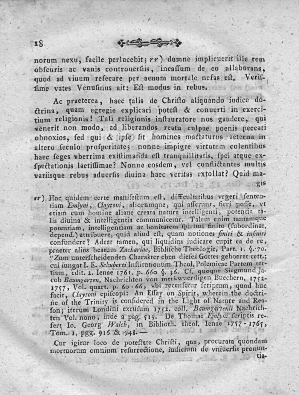 1r) Hoc quidem certe manifeſtum eſt, dictcultatibus vrgeri ſenten- tiam Emyyni, Claytoni, aliorumque, qui aſſerunt, fieri poſſe, vt etiam cum homine aliaue creata natura intelligenti, potentia ta- lis diuina& intelligentia communicerur. Talem enim tantamque potentiam, intelligentiam ac bonitatem ſpiritui finito(ſubordinat. depend.) attribuere, quid aliud eſt, quam notiones finiti& iufiniri confundere? Adeat tamen, qui liquidius iudicare cupit ea de re, praeter alios beatum Zachariae, Bibliſche Theologie, Part. 1.§. 70. „Zum unterſcheidenden Charakter eben dieſes Gottes gehoeret cett.; cui iungat I. E. Sclugerri Inſtitutionum Theol. Polemicae Partem ter- tiam, edit. 2. lenae 1761. p. 660§. 36. Cf. quoaue Siegmund Ja- cob Baumgarten, Nachrichten von merkwuerdigen Buechern, 1752- 1757, Vol. quart. p. 60 ·66, vbi recenſetur ſeriptum, quod huc facit, Cloyroni epiſcopi: An Eſſay on Spirit, wherein the doctri- ne of the Trinity is conſidered in the Light of Nature and Rea- ſon; iterum Londini excuſum 1772. coll. Baumgarteni Naehrich- ten Vol. nono, inde a pag. Sr9. De Thomae Dunbdl feriptis re- ferz Io. Georg Walch, in Bibliorh. theol. lenae 1777- 1765, Tom. 1. pgg. 916& 948.—— 1 6