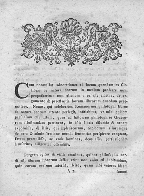 gumento& praeſtantia horum librorum quaedam prae- mittere. Nemo, qui celeberrimi Romanorum philoſophi libros de natura deorum attente perlegit, infitiabitur, vt mihi quidem perſuaſum eſt, illum, quae ad hiſtoriam philoſophiae Graeco- rum illaſtrandam pertinent, in iſtis libris dilucide& ornate expofuiſfe,& illis, qui Epicurcorum, Stoicorum aliorumque de ortu& adminiſtratione mundi ſententias perſpicere exoptant, facem praetuliſſe, ac vnde homines, deos eſſe, perfuaſionem hauferint, diligenter oſtendiſſe.