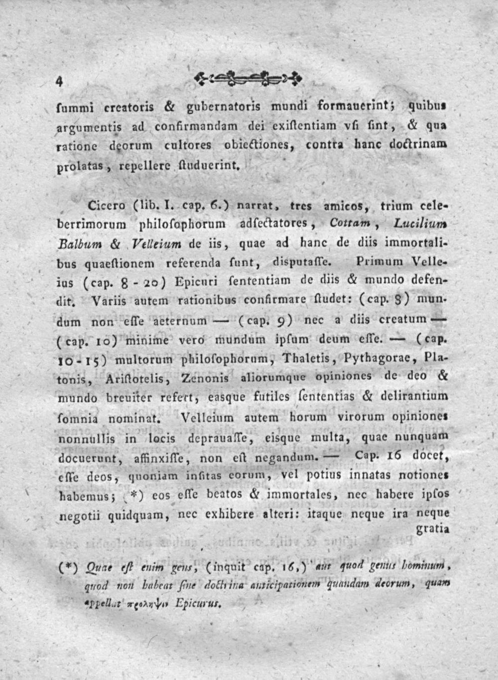 Cicero(lib. I. cap. 6.) narrat, tres amicos, trium cele- berrimorum philofophorum adſectatores, Cotram, Lucilium Balbum& Velleium de iis, quae ad hane de diis immortali- bus quaeſtionem referenda funt, disputaſſe. Primum Velle- ius(cap. 8- 20) Epicuri ſententiam de diis& mundo defen- dit. Variis autem rationibus confirmare ſtudet:(cap. 8) mun. dum non eſfe aeternum—(cap. 9) nec a diis creatum— (cap. 10) minime vero mundum ipſum deum eſfe.—(cap. 10-15) multorum philofophorum, Thaletis, Pythagorae, Pla- tonis, Ariſtotelis, Zenonis aliorumque opiniones de deo& mundo breuiter refert, easque futiles ſententias& delirantium fomnia nominat. Velleium autem horum virorum opiniones nonnullis in locis deprauaſfe, eisque multa; quae nunquam docuerunt, affnxiſſe, non eſt negandum.— Cap. 16 docet, eſſe deos, quoniam inſitas eorum, vel potius innatas notiones habemus;.*) eos eſſe beatos& immortales, nec habere ipfos