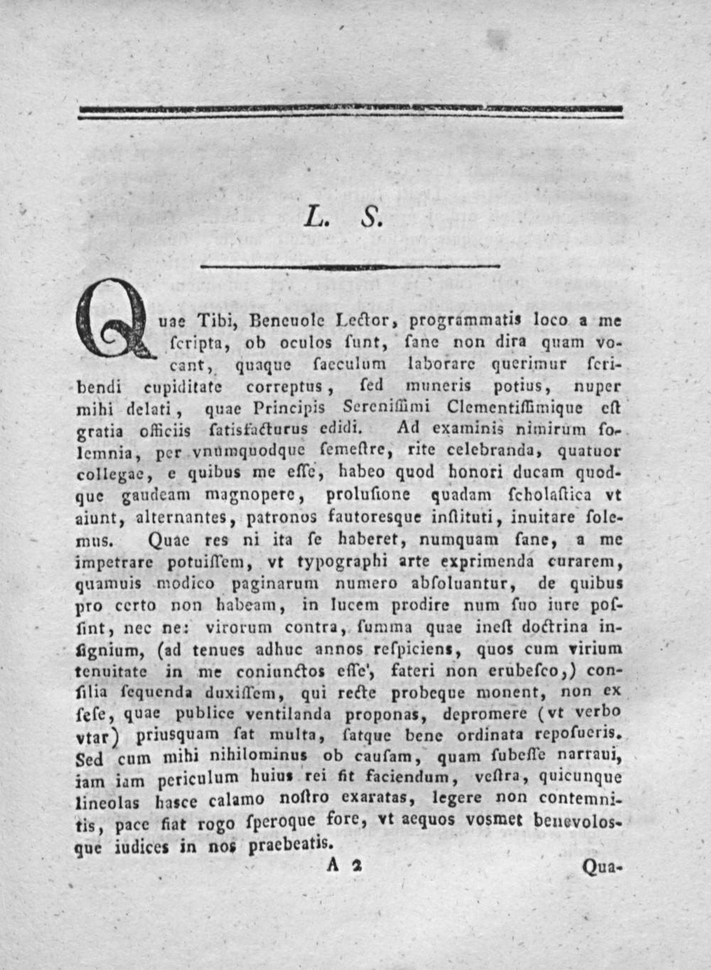 uge Tibi, Bencuole Lector, programmatis loco a me ſeripta, ob oculos funt, ſane non dira quam vo- cant, quaque ſacculum laborare querimur ſeri- bendi cupiditate correptus, ſed muneris potius, nuper mihi delati, quae Principis Sereniſimi Clementiffimique eſt gratia officiis ſatis facturus edidi. Ad examinis nimirum fo- lemnia, per vnumquodque ſemeſtre, rite celebranda, quatuor collegac, e quibus me eſſe, habeo quod honori ducam quod- que gaudeam magnopere, proluſione quadam ſcholaſtica vt aiunt, alternantes, patronos fautoresque inſſituti, inuitare ſole- mus. Quae res ni ita ſe haberet, numquam ſane, a me impetrare potuiſfem, vt typographi arte exprimenda curarem, quamuis modico paginarum numero abſoluantur, de quibus pro certo non habeam, in lucem prodire num ſuo iure pof- ſint, nec ne: virorum contra, fumma quae ineſt doctrina in- ugnium,(ad tenues adhuc annos reſpiciens, quos cum virium tenuitate in me conianctos effe’, fateri non erubeſco,) con- ſilia ſequenda duxiſſfem, qui recte probeque monent, non ex ſeſe, quae publice ventilanda proponas, depromere(vt verbo vtar) priusquam ſat multa, fatque bene ordinata repofueris. ged cum mibi nihilominus ob cauſam, quam fubeſſe narraui, iam iam periculum huius rei fit faciendum, veſtra, quicunque lineolas hasce calamo noſtro exaratas, legere non contemni- tis, pace fiat rogo ſperoque fore, vt aequos vosmet benevolos- que iudices in nos praebeatis. A 2 Qua-