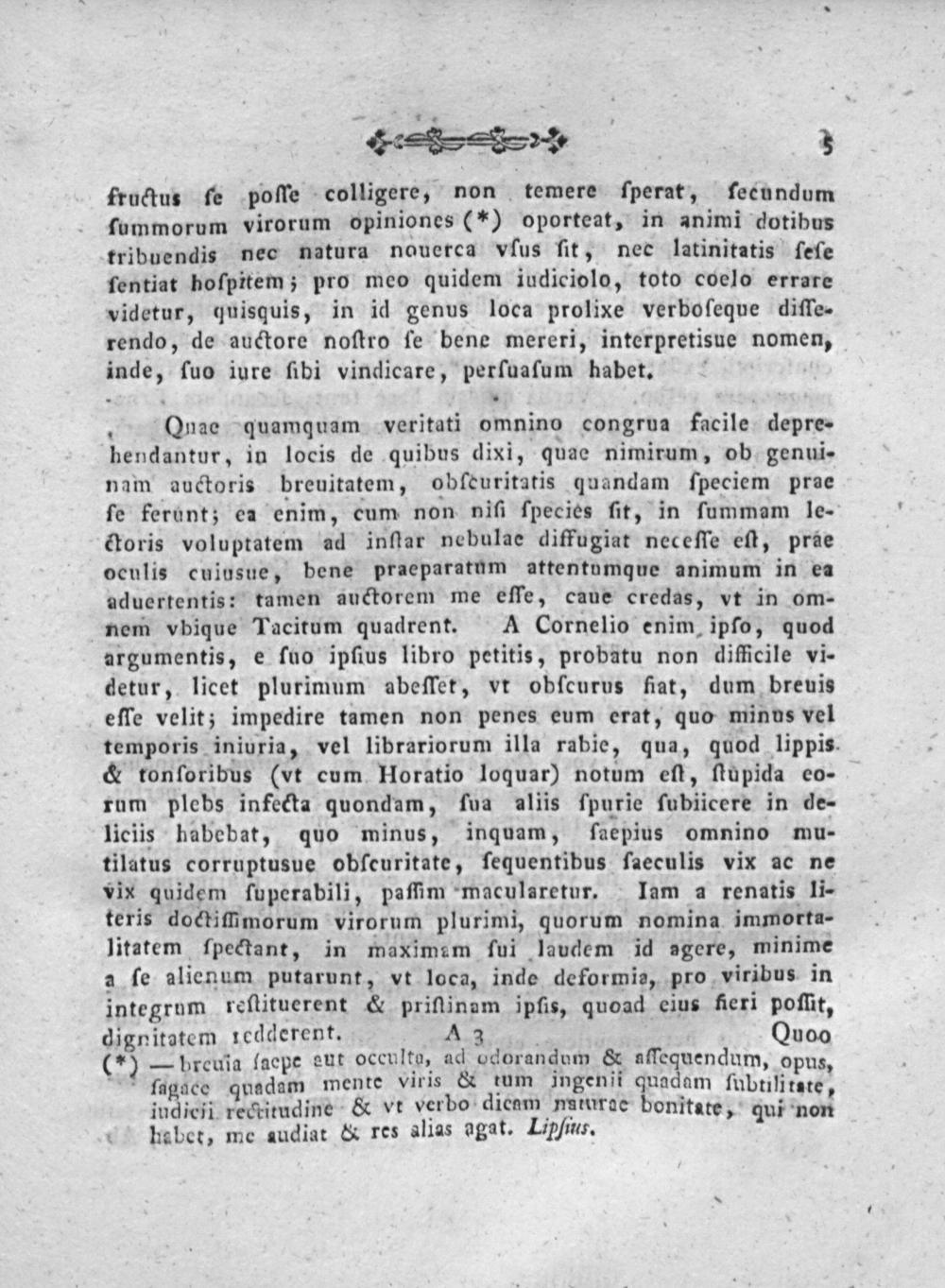 . OQnae quamquam veritati omnino congrua facile depre- hendantur, in locis de quibus dixi, quae nimirum, ob genui- nam auctoris breuitatem, obſeuritatis quandam ſpeciem prae ſe ferunt; ea enim, cum non niſi ſpecies ſit, in ſummam le- dtoris voluptatem ad inſtar nebulae diffugiat neceſſe eſt, prae oculis cuiusue, bene praeparatum attentumque animum in ea aduertentis: tamen auctorem me eſſe, caue credas, vt in om- nem vbique Tacitum quadrent. A Cornelio enim, ipſo, quod argumentis, e fuo ipſius libro petitis, probatu non diffcile vi- detur, licet plurimum abeſſet, vt obſcurus fiat, dum breuis eſſe velit; impedire tamen non penes eum erat, quo minus vel temporis iniuria, vel librariorum illa rabie, qua, quod lippis & tonſoribus(vt cum Horatio loquar) notum eſt, ſtupida eo- rum plebs infecta quondam, fua aliis ſpurie fubiicere in de- liciis habebat, quo minus, inquam, faepius omnino mu- tilatus corruptusue obſcuritate, ſequentibus faeculis vix ac ne vix quidem fuperabili, paſſim macularetur. Iam a renatis li- teris doctimmorum virorum plurimi, quorum nomina immorta- litatem ſpectant, in maximam fui laudem id agere, minime a ſe alienum putarunt, vt loca, inde deformis, pro viribus in integrum reſtituerent& priflinam ipfis, quoad eius fieri poſſt,