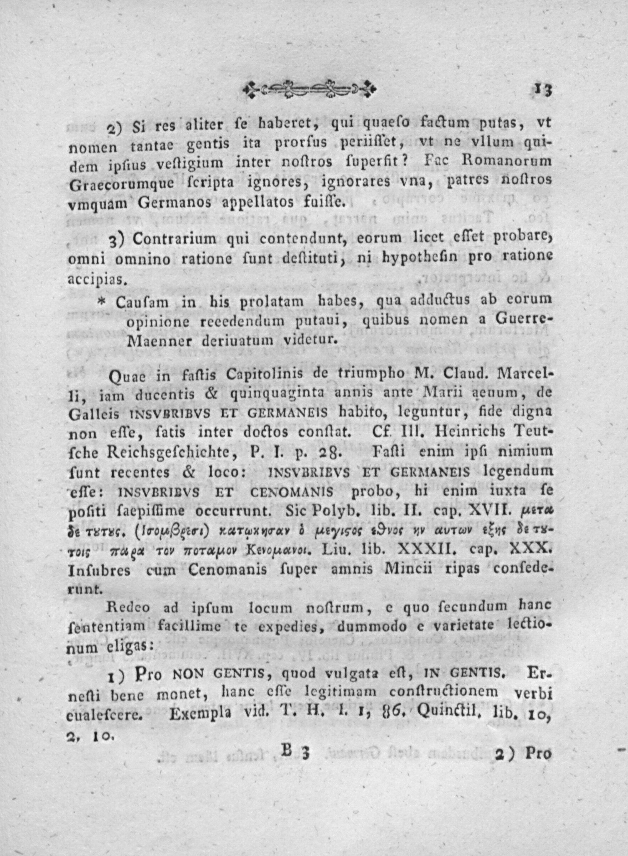 Quae in faſtis Capitolinis de triumpho M. Claud. Marcel- li, iam ducentis& quinquaginta annis ante Marii qenum, de Galleis INsvERIBVS ET GERMANEIS habito, leguntur, fide digna non eſſe, fatis inter doctos conſtat. Cf. III. Heinrichs Teut- ſche Reichsgefehichte, P. I. p. 28. Faſti enim ipſi nimium funt recentes& loco: MsvuRIBVS Er GERMANEIS legendum effe: MsvBRIVS Er CENOMANISs probo, hi enim iuxta ſe pofiti faepiſſime occurrunt. Sic Polyb. lib. II. cap. XVII. era de rvrue.(Iroeri) kargxngay à e) Ses*9vos wy avraw ehns de ·v- roi ra ga roy orapier Keroueror. Liu. lib. XXXII. cap. XXX. Infubres cum Cenomanis fuper amnis Mincii ripas conſede- runt.