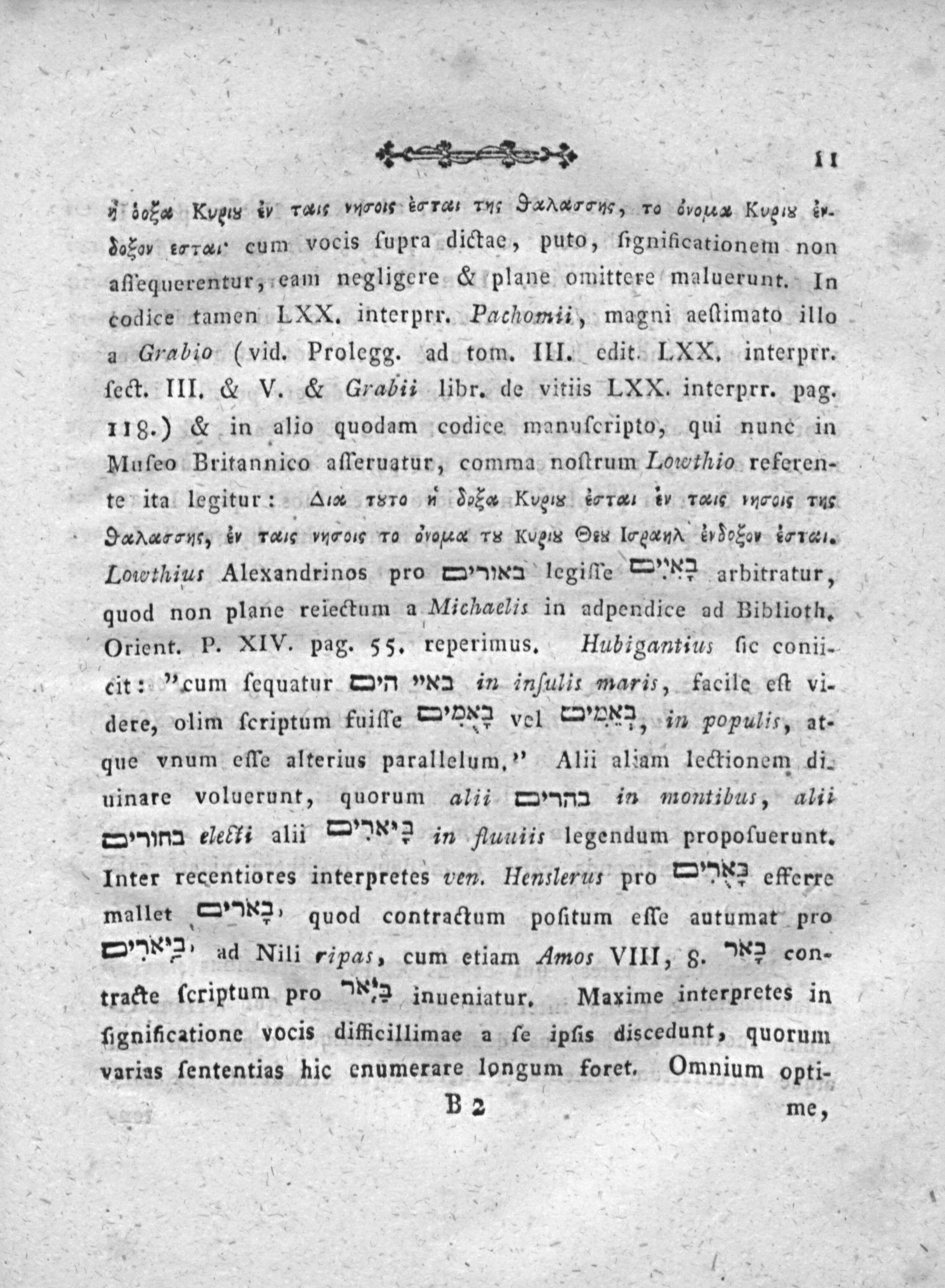 2 5oka Kupis iy Tau⁵ virois Era rus JSaxdgahe, ro dyouaa Koε⁴⁵ 32. Joro trrau cum vocis fupra dictac, puto, ſignificationem non aſfequerentur, eam negligere& plane omittere maluerunt. In codice tamen LXX. interprr. Pachomii, magni aeſtimato illo a Grabio(vid. Prolegg. ad tom. III. edit. L. XX. interprr. ſect. III.& V.& Grabii libr. de vitiis LXX. interprr. pag. 118.)& in alio quodam codice manuſcripto, qui nune in Muſfeo Britannico afferuatur, comma noſtrum Lowethio referen- te ita legitur: A 1810 Jora Kuom iaral ir raus 1ns rus Ja«aiε, ν raus"ncis ro 6/oa I8 Kügis QOes Lreæn ν detor inral. Loiwthius Alexandrinos pro tahten legiſſe—ure arbitratur, quod non plane reiectum a Michaelis in adpendice ad Biblioth.
