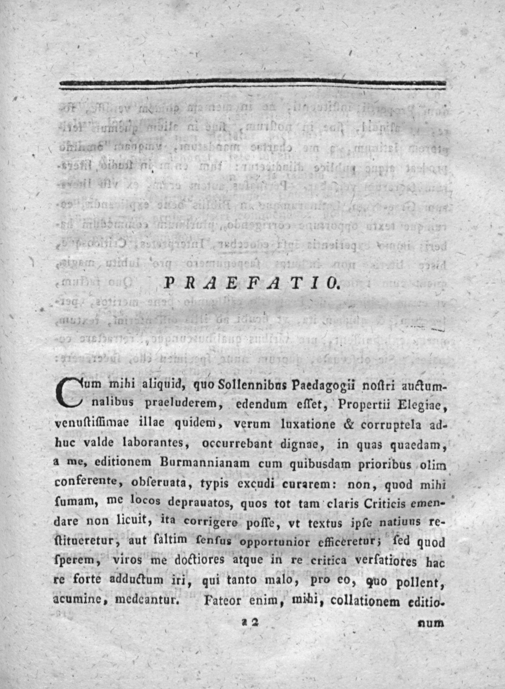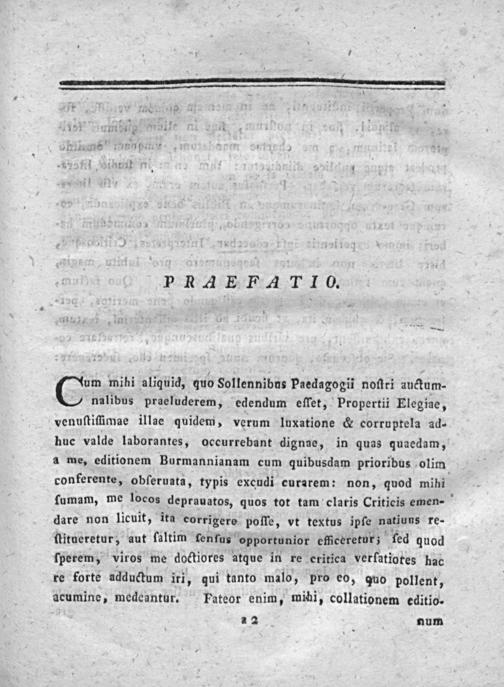 um mihi aliquid, quo Sollennibus Paedagogii noſtri auctum- C nalibus praeluderem, edendum eſſet, Propertii Elegiae, venuſtiſſimae illae quidem, verum luxatione& corruptela ad- huc valde laborantes, occurrebant dignae, in quas quaedam, a me, editionem Burmannianam cum quibusdam prioribus olim conferente, obſeruata, typis excudi curarem: non, quod mihi ſfumam, me locos deprauatos, quos tot tam claris Criticis emen- 3 dare non licuit, ita corrigero poſſe, vt textus ipſe natiuns re- ſtitueretur, aut faltim fenfus opportunior emceretur; fed quod ſperem, viros me doctiores atque in re critica verſatiotes hac re forte adductum iri, qui tanto malo, pro eo, quo pollent, acumine, medcantur. Fateor enim, mihi, collationem editio- 22 num
