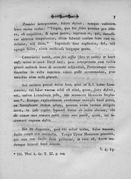 Sed meliora procul dubio funt, quae ad h. l. habet Leon- clauius, cui d rausra, nihil eſt aliud, quam, ſitire deſinit, vti, eodem Leonclauio teſte, iam monuerat Henricus Stepha- nus*. Eamque explicationem confirmant exempla haud pauca, ex NXenophonte ibidem adlata, quorum vnum tantum deligere inuat, in ipſo capite ſequenti ſtatim ab initio obuium, vbi 1de xAauuwr rore srauere reddi aliter non poteſt, quam, nec la- crumari vnquam deſiit.
