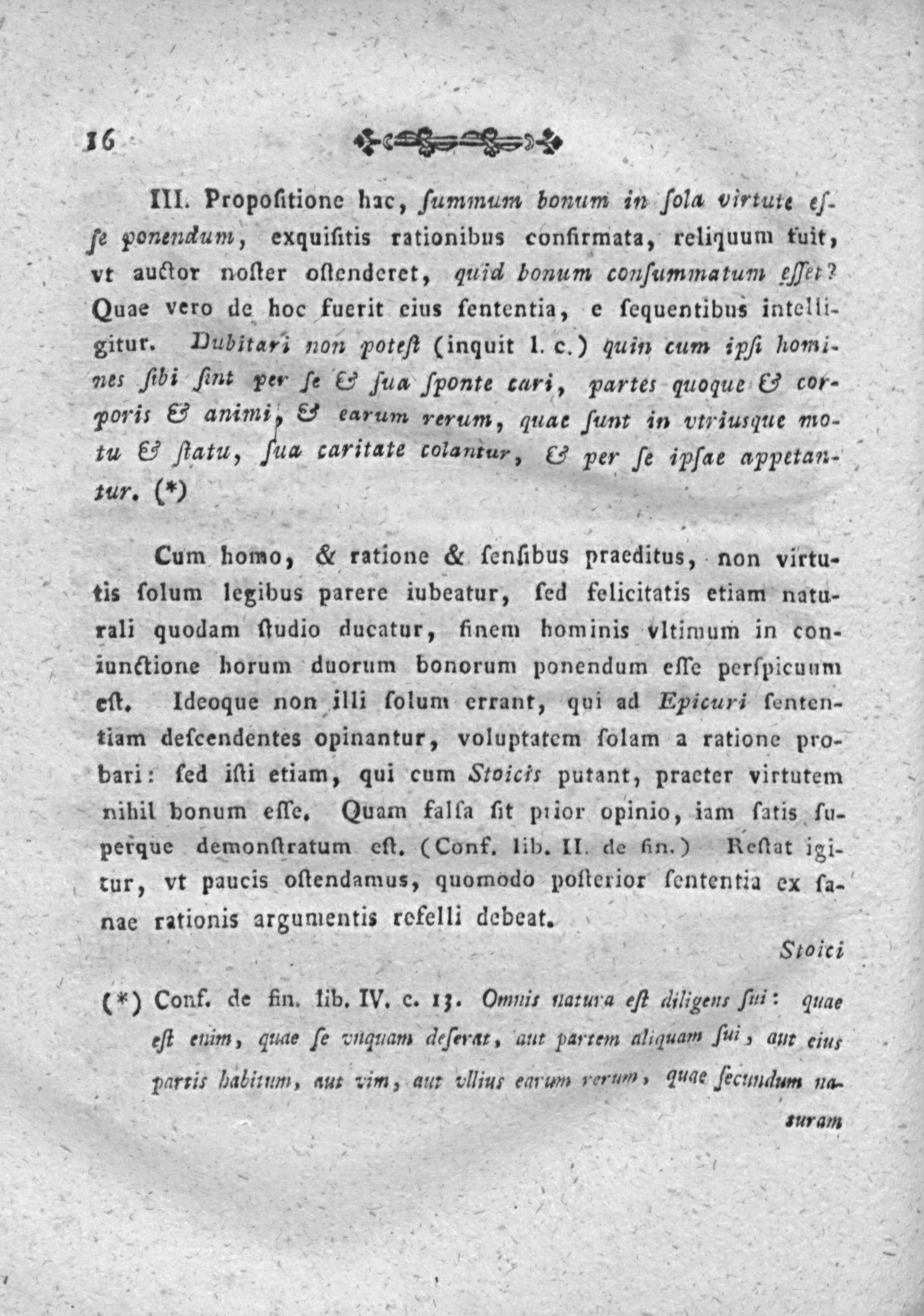Cum homo,& ratione& ſenſibus praeditus, non virtu- tis folum legibus parere iubeatur, fed felicitatis etiam natu- rali quodam ſtudio ducatur, finem hominis vltimum in con- iunctione horum duorum bonorum ponendum eſſe perſpicuum eſt. ldeoque non illi ſolum errant, qui ad Epicuri fenten- tiam deſcendentes opinantur, voluptatem ſolam a ratione pro- bari: fed iſti etiam, qui cum Stoicis putant, practer virtutem nihil bonum eſſfe. Quam falfa ſit prior opinio, iam ſatis fu- perque demonſtratum eſt.(Conf. lib. II. de fin.) Reſtat igi- tur, vt paucis oſtendamus, quomodo poſterior ſententia ex ſa- nae rationis argumentis refelli debeat.