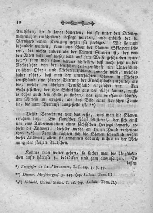 Bernhard einen Kreuzzug gegen ſie predigte. Wie ſie nun behandelt wurden, kann uns ſchon der Namen Sklaven leh⸗ ren, der nichts anders als der Namen Slaven iſt, der von den Alten bald auf dieſe, bald auf jene Weiſe geſchrieben wur⸗ de;*) kann man ſchon daraus ſchlieſſen, daß noch jetzt in der Rechtslehre von der keutſchen Leibeigenſchaft ein Unterſchied