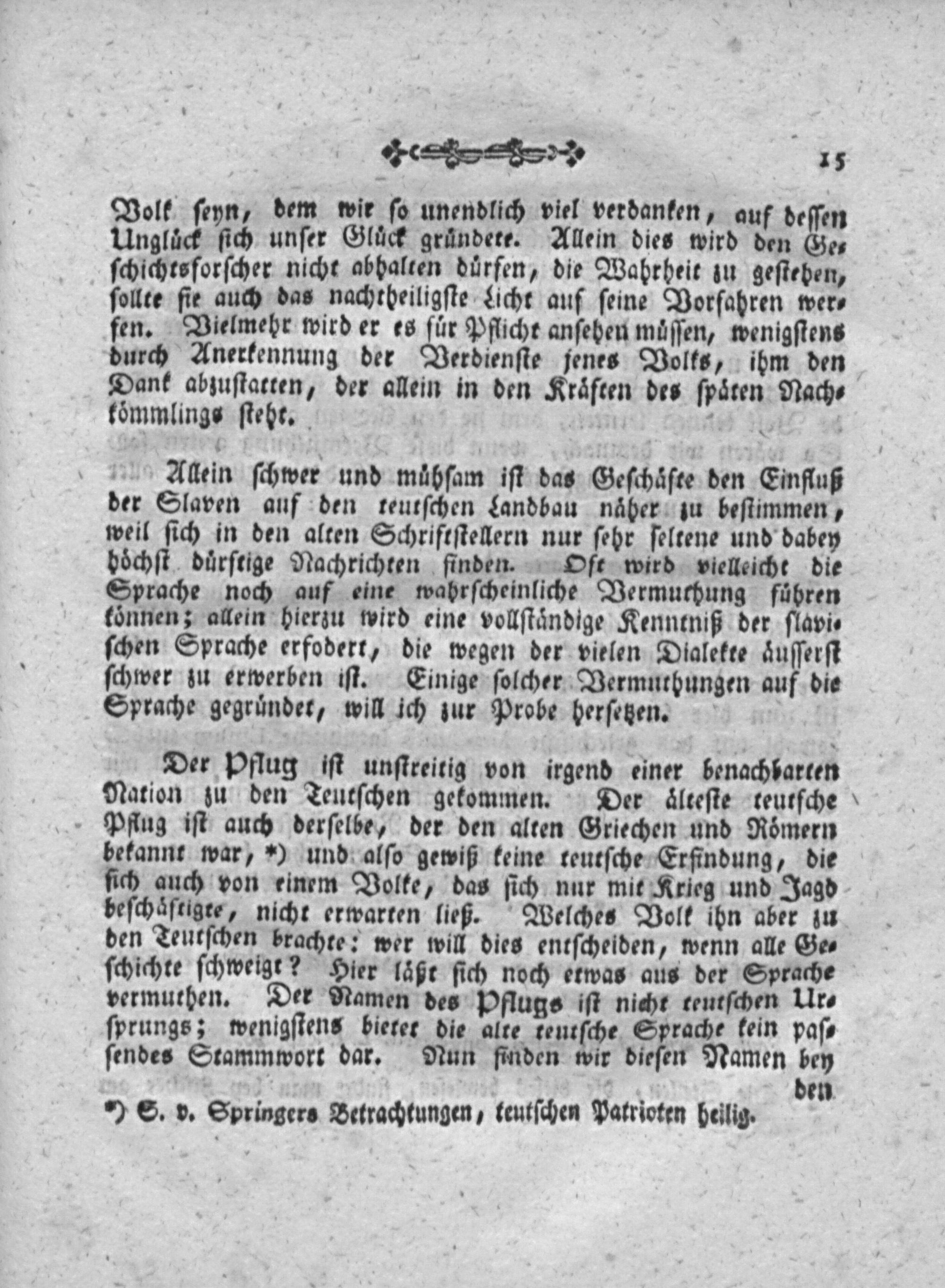 Der Pflug iſt unſtreitig von irgend einer benachbarten Nation zu den Teutſchen gekommen. Der aͤlteſte teutſche Pflug iſt auch derſelbe, der den alten Griechen und Roͤmern bekannt war,*) und alſo gewiß keine teutſche Erfindung, die ſich auch von einem Volke, das ſich nur mit Krieg und Jagd beſchaͤfrigee, nicht erwarten ließ. Welches Bolt ihn aber zu den Teutſchen brachte: wer will dies entſcheiden, wenn alle Ge⸗ ſchichte ſchweigt? Hier laͤßt ſich noch erwas aus der Sprache vermuthen. Der Namen des Pflugs iſt nicht teutſchen Ur⸗ ſprungs; wenigſtens bieter die alre keutſche Sprache kein paſ⸗ ſendes Stammwort dar. Nun finden wir dieſen Namen bey