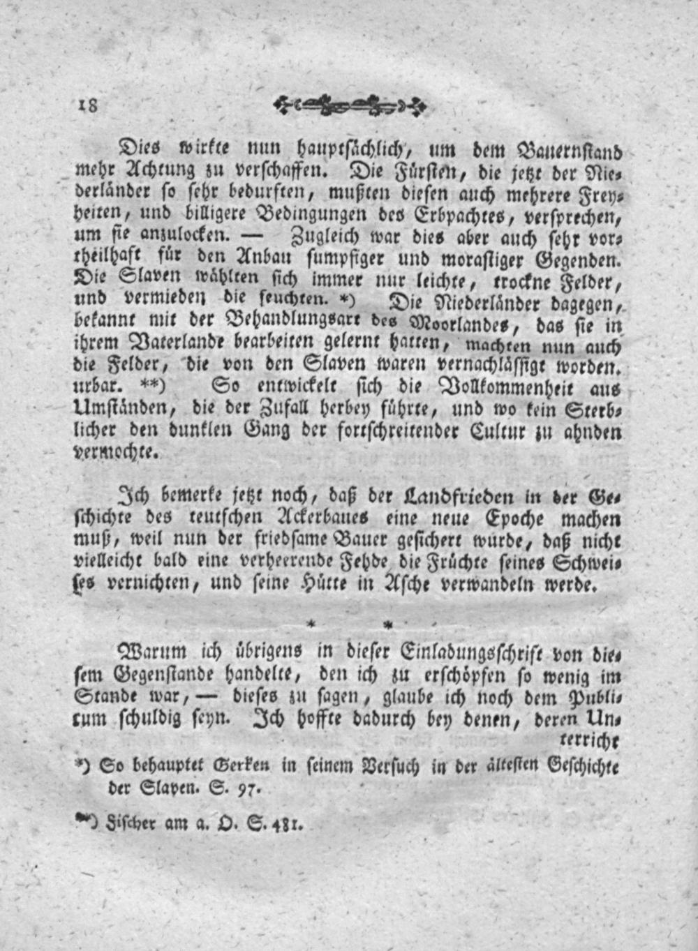 Dies wirkte nun hauptſächlich, um dem Bauernſtand mehr Achtung zu verſchaffen. Die Fuͤrſten, die jetzt der Nie⸗ derlaͤnder ſo ſehr bedurften, mußten dieſen auch mehrere Frey⸗ heiten, und billigere Bedingungen des Erbpachtes, verſprechen, um ſie anzulocken.— Zugleich war dies aber auch ſehr vor⸗ theilhaft für den Anbau ſumpfiger und moraſtiger Gegenden. Die Slaven waͤhlten ſich immer nur leichte, trockne Felder, und vermieden die ſeuchten.* Die Niederlaͤnder dagegen, bekannt mit der Behandlungsart des Moorlandes, das ſie in ihrem Vaterlande bearbeiten gelernt hatten, machten nun auch die Felder, die von den Slaven waren vernachlaͤſſigt worden. urbar.**) So entwickelt ſich die Vollkommenheit aus Umſtaͤnden, die der Zufall herbey fuͤhrte, und wo kein Sterb⸗ licher den dunklen Gang der fortſchreitender Cultur zu ahnden vermochte.