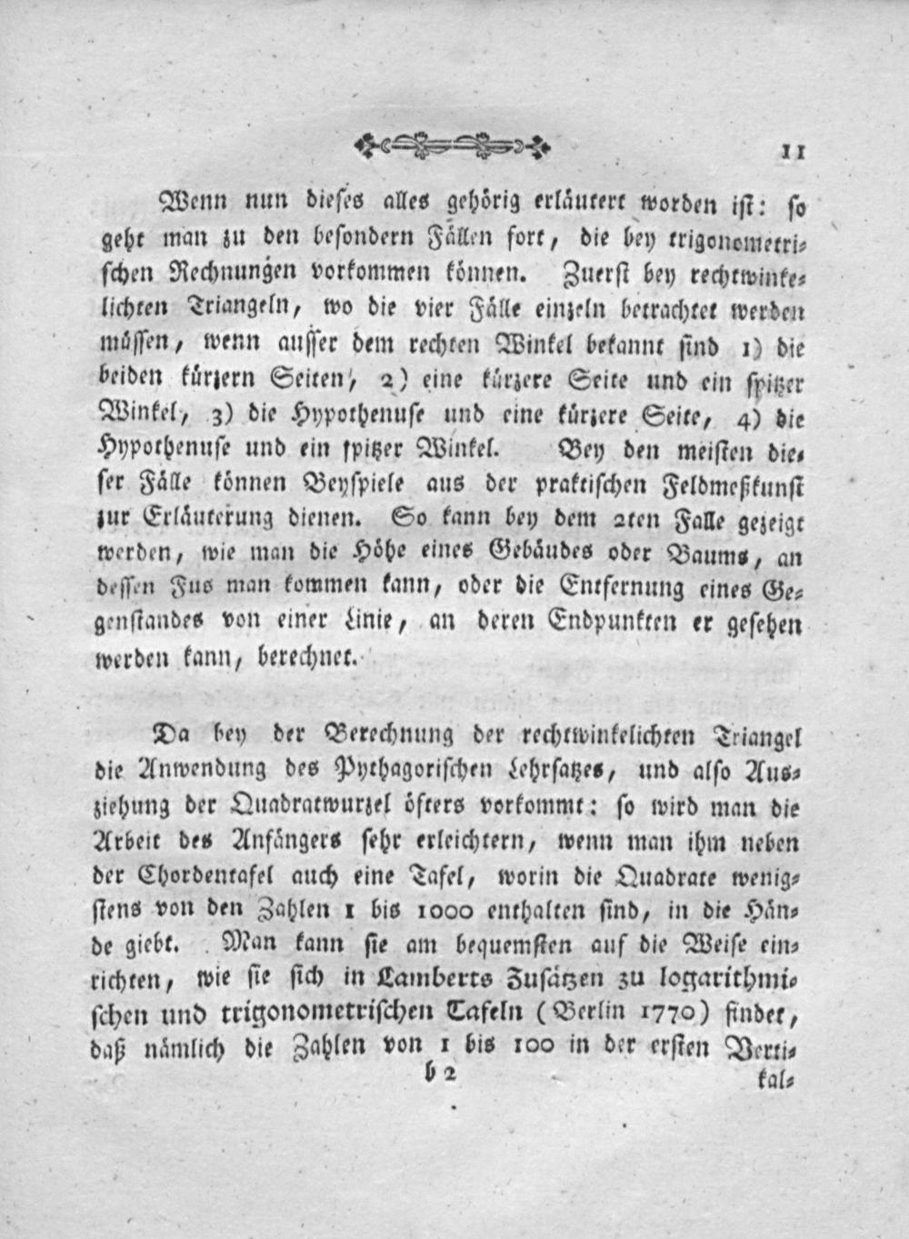 Da bey der Berechnung der rechtwinkelichten Triangel die Anwendung des Pyethagoriſchen Lehrſatzes, und alſo Aus⸗ ziehung der Quadratwurzel öͤfters vorkommt: ſo wird man die Arbeit des Anfaͤngers ſehr erleichtern, wenn man ihm neben der Chordentafel auch eine Tafel, worin die Quadrate wenig⸗ ſtens von den Zahlen 1 bis 1000 enthalten ſind, in die Hän⸗ de giebt. Man kann ſie am bequemſten auf die Weiſe ein⸗ richten, wie ſie ſich in Lamberts Zuſaͤtzen zu logarithmi⸗ ſchen und trigonometriſchen Tafeln(Berlin 1770) finder,