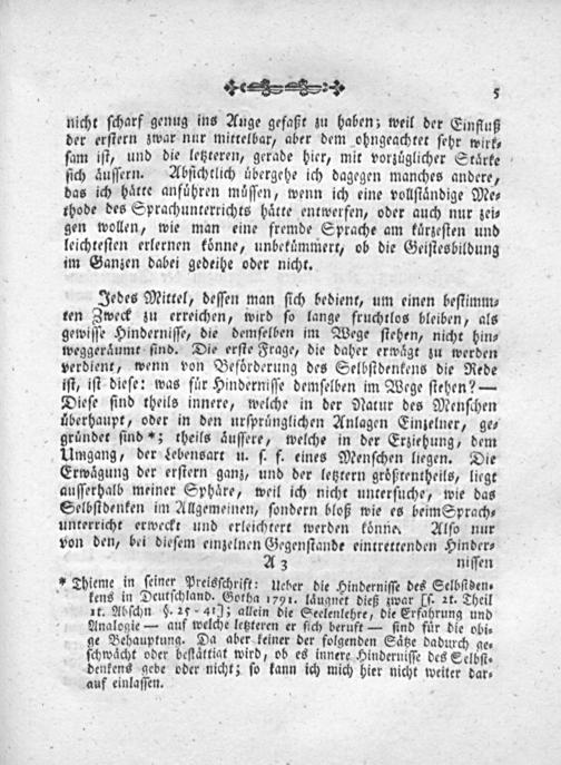 Jedes Mittel, deſſen man ſich bedient, um einen beſtimm⸗ ten Zweck zu erreichen, wird ſo lange fruchtlos bleiben, als gewiſſe Hinderniſſe, die demſelben im Wege ſtehen, nicht hin⸗ weggeraͤumt ſind. Die erſte Frage, die daher erwaͤgt zu werden verdient, wenn von Befoͤrderung des Selbſtdenkens die Rede iſt, iſt dieſe: was fuͤr Hinderniſſe demſelben im Wege ſtehen?— Dieſe ſind theils innere, welche in der Natur des Menſchen uͤberhaupt, oder in den urſpruͤnglichen Anlagen Einzelner, ge⸗ gruͤndet ſind*; theils aͤuſſere, welche in der Erziehung, dem Umgang, der Lebensart u. ſ. f. eines Menſchen liegen. Die Erwaͤgung der erſtern ganz, und der letztern größtentheils, liegt auſſerhalb meiner Sphaͤre, weil ich nicht unterſuche, wie das Selbſtdenken im Allgemeinen, ſondern bloß wie es beim Sprach⸗ unterricht erweckt und erleichtert werden koͤnne, Alſo nur von den, bei dieſem einzelnen Gegenſtande eintrettenden Hinder⸗