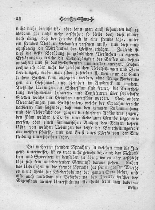 Bei mehreren fremden Sprachen, in welchen man die Ju⸗ gend unterweiſer, iſt es zwar nicht gewoͤhnlich, auch das Schrei⸗ ben und Sprechen in denſelben zu uͤben; wo es aber geſchieht laͤßt ſich kein unbedeutender Gewinnſt daͤraus ziehen. Schon das Ueberſetzen in die fremde Sprache hat ſeinen groſſen Werth; es dient theils zur Wiederhohlung der ganzen Sprachlehre, und alſo auch mittelbar zur Befoͤrderung des Zwecks, welcher der Gegenſtand meiner Unterſuchung iſt; cheils lernt man dabei—