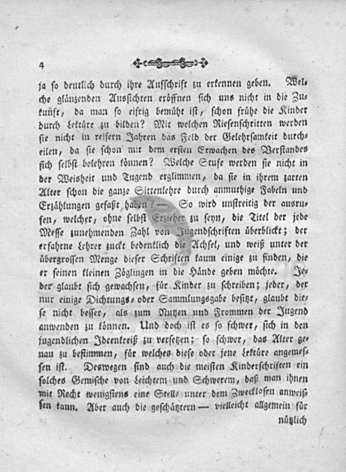 ja ſo deutlich durch ihre Aufſchrift zu erkennen geben. Wel⸗ che glaͤnzenden Ausſichten eroͤffnen ſich uns nicht in die Zu⸗ kunft, da man ſo eifrig bemuͤht iſt, ſchon fruͤhe die Kinder durch Lektuͤre zu bilden? Mit welchen Rieſenſchritten werden ſie nicht in reifern Jahren das Feld der Gelehrſamkeit durch⸗ eilen, da ſie ſchon mit dem erſten Erwachen des Verſtandes ſich ſelbſt belehren köͤnnen? Welche Stufe werden ſie nicht in der Weisheit und Tugend erglimmen, da ſie in ihrem zarten Alter ſchon die ganze Sittenlehre durch anmuthige Fabeln und Erzaͤhlungen gefaßt baben So wird unſtreitig der ausru⸗ ſen, welcher, ohne ſelbſt Eriieher zu ſeyn, die Titel der jede Meſſe zunehmenden Zahl von gendſchriften uͤberblickt; der erfahrne Lehrer zuckt bedenklich die Achſel, und weiß unter der uͤbergroſſen Menge dieſer Schriften kaum einige zu finden, die er ſeinen kleinen Zoͤglingen in die Haͤnde geben moͤchte. Je⸗ der glaubt ſich gewachſen, fuͤr Kinder zu ſchreiben; jeder, der nur einige Dichtungs⸗ oder Sammlungsgabe beſitzt, glaubt die⸗ ſe nicht beſſer, als zum Nutzen und Frommen der Jugend anwenden zu koͤnnen. Und doch iſt es ſo ſchwer, ſich in den jugendlichen Ideenkreiß zu verſetzen; ſo ſchwer, das Alter ge⸗ nau zu beftimmen, fuͤr welches dieſe oder jene Lektuͤre angemeſ⸗ ſen iſt. Deswegen ſind auch die meiſten Kinderſchriften ein ſolches Gemiſche von Leichtem und Schwerem, daß man ihnen mit Recht wenigſtens eine Stelle unter dem Zweckloſen anweiß⸗ ſen tann. Aber auch die geſchätzrern— vielleicht allgemein fuͤr