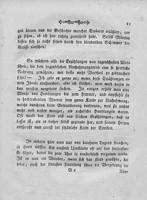 So moͤchten alſo die Erzaͤhlungen von tugendhaften Men⸗ ſchen, die dem jugendlichen Nachahmungstrieb eine ſo herrliche Nahrung gewaäͤhren, mit deſto mehr Vortheil zu gebrauchen feyn!— Ich gebe es gerne zu; wenn dieſe Erzaͤhlungen ei⸗ nem Ideale entſprechen; aber ich fuͤrchte, man wird dieſes in den meiſten vergebens ſuchen. In einigen erhebr man eine Menge von Handlungen bis zum Himmel, und empffehlt ſie in hochtrabenden Worten dem guten Kinde zur Nachahmung, welche durchaus keine Bewunderung verdienen, weil ſie nichts mehr und niches weniger, als rechtliche Handlungen waren. Oft merkt das Kind erſt aus ſolchen Erzaͤhlungen, daß es beſſer iſt, als es bisher ſelbſt geglaubt hat, und ſeinem Herzen entſproßt nun zuerſt der ſchaͤdliche Keim der Eitelkeit.