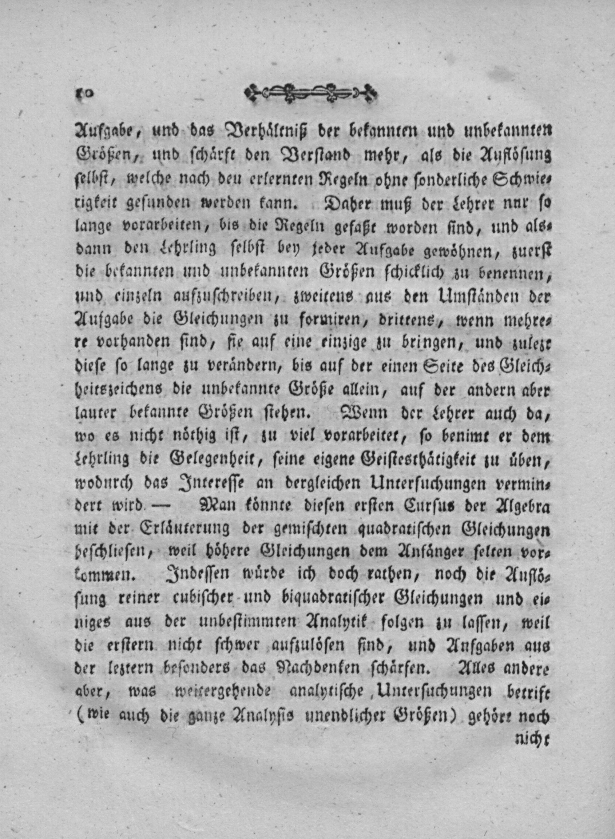 Aufgabe, und das Verhaͤltniß der bekannten und unbekannten Größen, und ſchaͤrft den Verſtand mehr, als die Aufloͤſung ſelbſt, welche nach deu erlernten Regeln ohne ſonderliche Schwie⸗ rigkeit geſunden werden kann. Daher muß der Lehrer nur ſo lange vorarbeiten, bis die Regeln gefaße worden ſind, und als⸗ dann den Lehrling ſelbſt bey jeder Aufgabe gewoͤhnen, zuerſt die bekannten und unbekannten Groͤßen ſchicklich zu benennen, und einzeln aufzuſchreiben, zweitens aus den Umſtaͤnden der Aufgabe die Gleichungen zu formiren, drittens, wenn mehre⸗ re vorhanden ſind, fie auf eine einzige zu bringen, und zulezt dieſe ſo lange zu veraͤndern, bis auf der einen Seite des Gleich⸗ heitszeichens die unbekannte Groͤße allein, auf der andern aber lauter bekannte Groͤßen ſtehen. Wenn der Lehrer auch da, wo es nicht noͤthig iſt, zu viel vorarbeitet, ſo benimt er dem lehrling die Gelegenheit, ſeine eigene Geiſtesthaͤtigkeit zu uͤben, wodurch das Intereſſe an dergleichen Unterſuchungen vermin⸗ dert wird— Man eoͤnnte dieſen erſten Curſus der Algebra mit der Erlaͤuterung der gemiſchten quadratiſchen Gleichungen beſchlieſen, weil hoͤhere Gleichungen dem Anfaͤnger ſelten vor⸗ kommen. Indeſſen wuͤrde ich doch rathen, noch die Auſtiöͤ⸗ ſung reiner cubiſcher und biquadratiſcher Gleichungen und ei⸗ niges aus der unbeſtimmten Analytik folgen zu laſſen, weil die erſtern nicht ſchwer auftuloͤſen find, und Anſgaben aus der leztern beſonders das Nachdenken ſchaͤrfen. Alles andere aber, was weitergehende analytiſche Unterſuchungen betrift dne auch die ganze Analyſis unendlicher Groͤßen) gehoͤrt noch