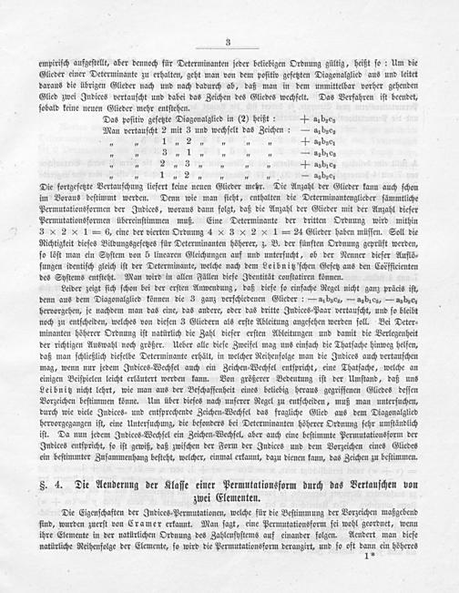 Die Eigenſchaften der Indices⸗Permutationen, welche für die Beſtimmung der Vorzeichen maßgebend ſind, wurden zuerſt von Cramer erkannt. Man ſagt, eine Permutationsform ſei wohl geordnet, wenn ihre Elemente in der natürlichen Ordnung des Zahlenſyſtems auf einander folgen. Aendert man dieſe natürliche Reihenfolge der Elemente, ſo wird die Permutationsform derangirt, und ſo oft dann ein höheres