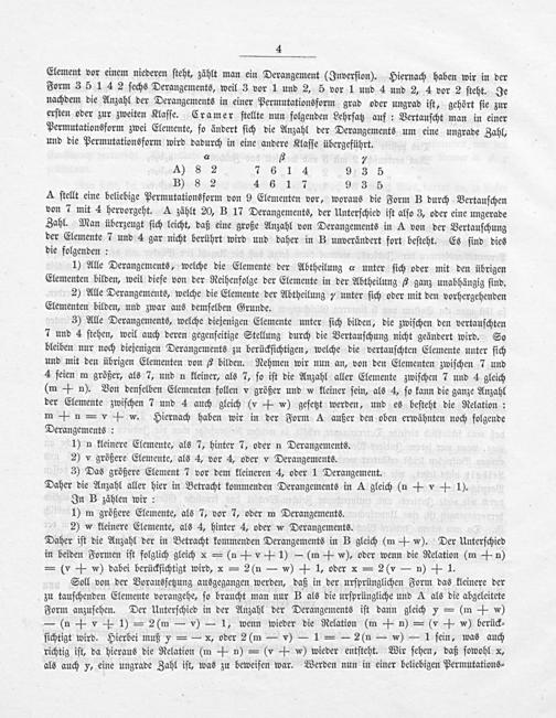 Element vor einem niederen ſteht, zählt man ein Derangement(Inverſion). Hiernach haben wir in der Form 3 5 1 42 ſechs Derangements, weil 3 vor 1 und 2, 5 vor 1 und 4 und 2, 4 vor 2 ſteht. Je nachdem die Anzahl der Derangements in einer Permutationsform grad oder ungrad iſt, gehört ſie zur erſten oder zur zweiten Klaſſe. Cramer ſtellte nun folgenden Lehrſatz auf: Vertauſcht man in einer Permutationsform zwei Elemente, ſo ändert ſich die Anzahl der Derangements um eine ungrade Zahl, und die Permutationsform wird dadurch in eine andere Klaſſe übergeführt.