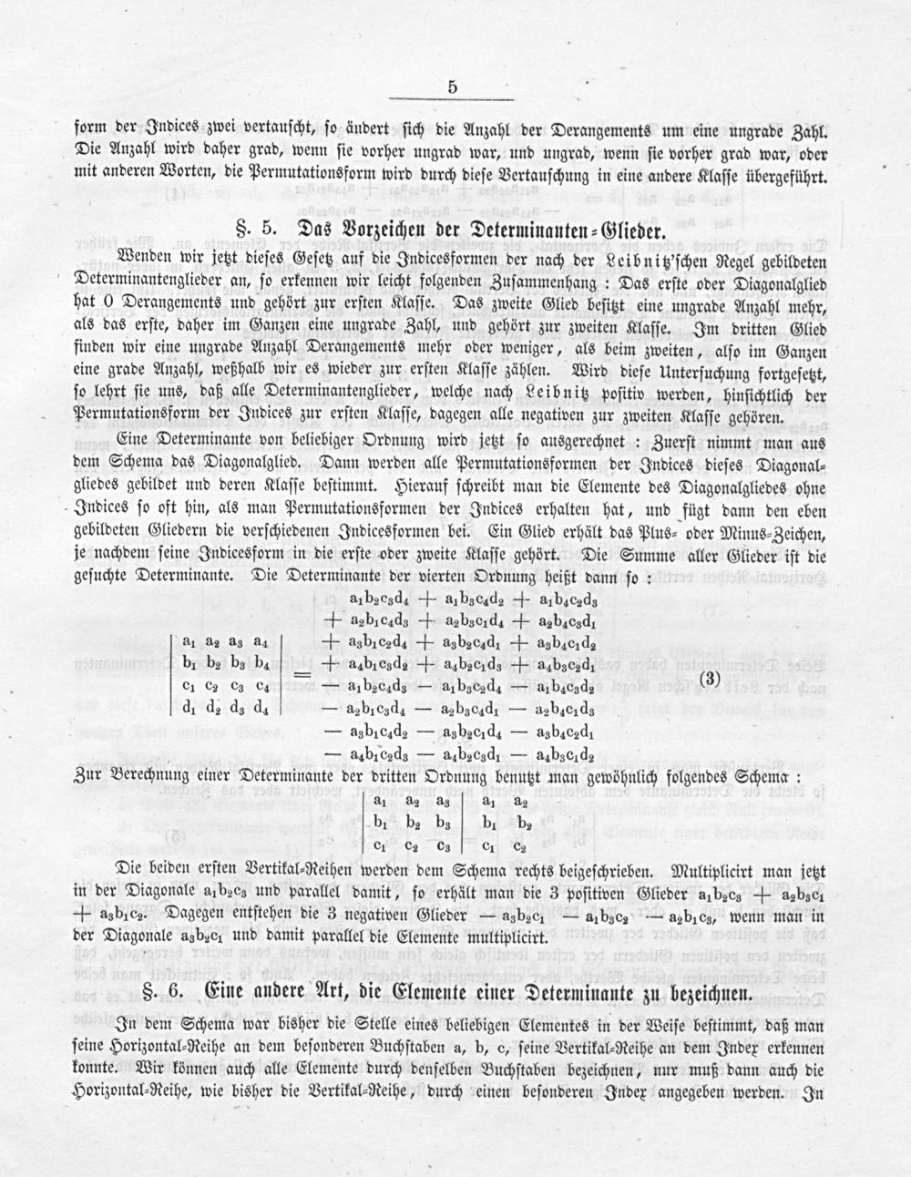 Wenden wir jetzt dieſes Geſetz auf die Indicesformen der nach der Leibnitz'ſchen Regel gebildeten Determinantenglieder an, ſo erkennen wir leicht folgenden Zuſammenhang: Das erſte oder Diagonalglied hat 0 Derangements und gehört zur erſten Klaſſe. Das zweite Glied beſitzt eine ungrade Anzahl mehr, als das erſte, daher im Ganzen eine ungrade Zahl, und gehört zur zweiten Klaſſe. Im dritten Glied finden wir eine ungrade Anzahl Derangements mehr oder weniger, als beim zweiten, alſo im Ganzen eine grade Anzahl, weßhalb wir es wieder zur erſten Klaſſe zählen. Wird dieſe Unterſuchung fortgeſetzt, ſo lehrt ſie uns, daß alle Determinantenglieder, welche nach Leibnitz poſitiv werden, hinſichtlich der Permutationsform der Indices zur erſten Klaſſe, dagegen alle negativen zur zweiten Klaſſe gehören.