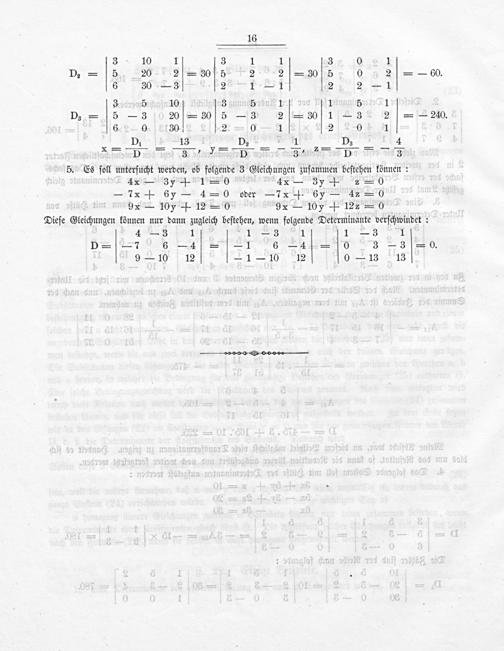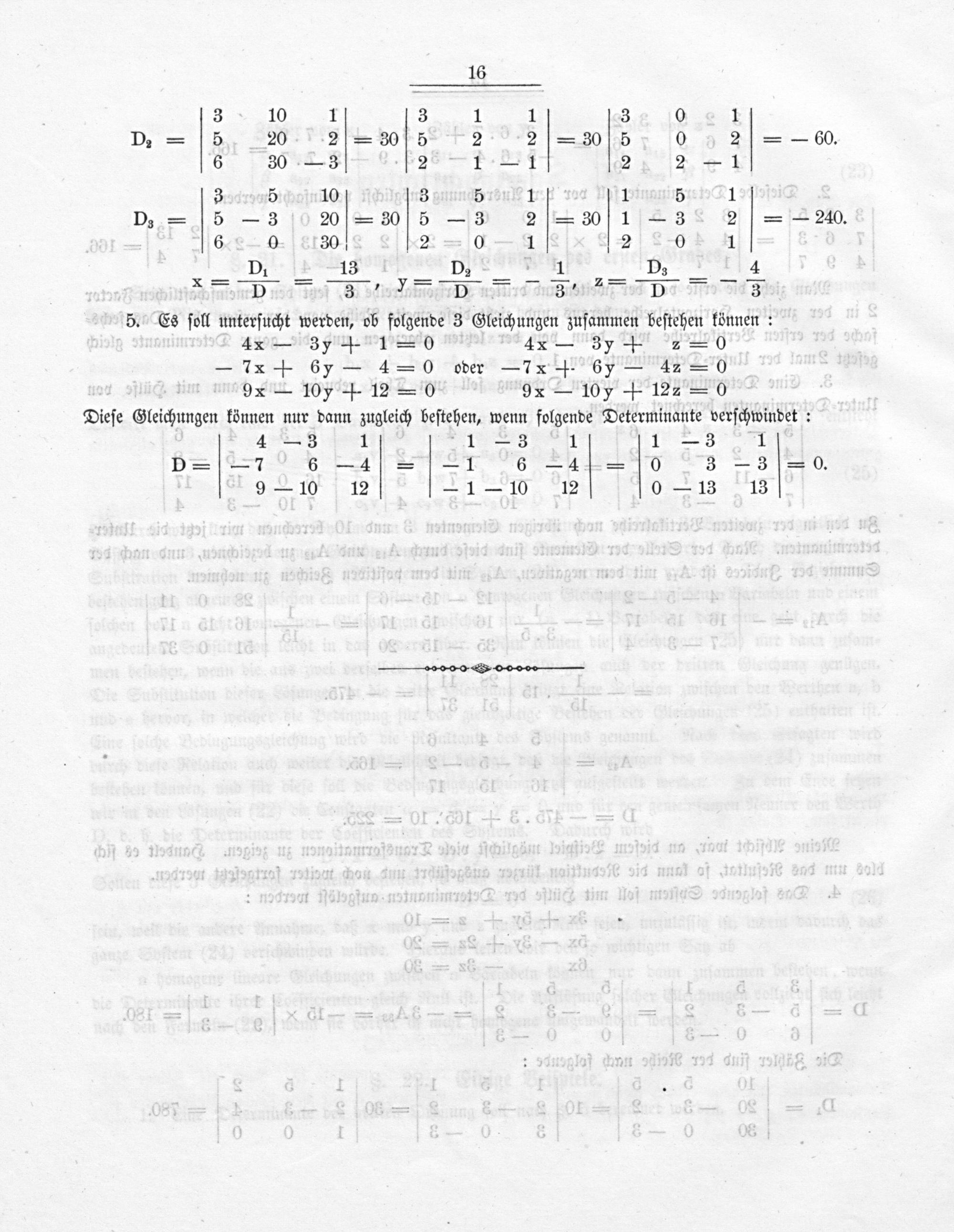 3 10 1 3 4 1 3 0 1 Dz;= 5 20 2= 30 5 2 2= 30 5 0 2=— 60. 6 30— 3 2 1— 1 2 2— 1 3 5 10 3 5 1 1 5 1 Dz= 5— 3 20= 30 5— 3 2= 30 1— 3 2=— 240. 6 0 30 2 0 1 2 0 1 D 113 SeeD, D 4 ſmnD na ſi. 3a Di ni i P e 5. Es ſoll unterſucht werden, ob folgende 3 Gleichungen zuſammen beſtehen können: 4— 3y+ 1= 0 4 x— 3y+ 2= 0 — 7X+ 6y— 4= 0 oder— 7 x+. 6y— 42= 0 9 x— 10y+ 12= 0 9 x— 10y+ 12²½= 0 Dieſe Gleichungen können nur dann zugleich beſtehen, wenn folgende Determinante verſchwindet: 4— 3 1 1— 3 1 1— 3 1 5= 6— 4=-— 1 6— 4= 0 3—3= 0. 9—; 10 12— 1— 10 12 0— 13 13