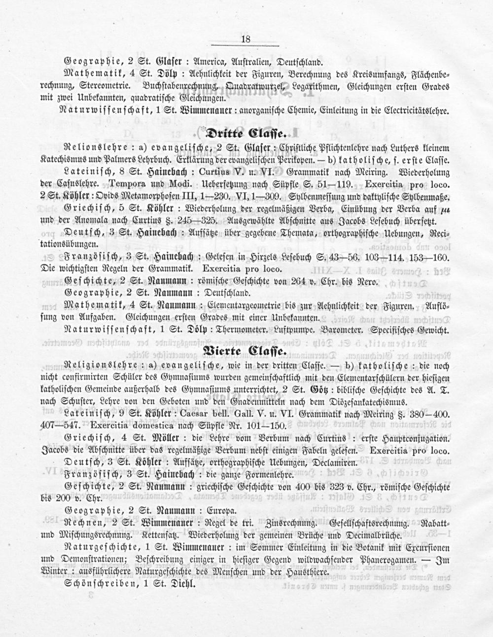 Religionslehre: a) evangeliſche, wie in der dritten Claſſe.— b) katholiſche: die noch nicht confirmirten Schüler des Gymnaſiums wurden gemeinſchaftlich mit den Elementarſchülern der hieſigen katholiſchen Gemeinde außerhalb des Gymnaſiums unterrichtet, 2 St. Götz: bibliſche Geſchichte des A. T. nach Schuſter, Lehre von den Geboten und den Gnadenmitteln nach dem Dißzeſankatechismus.