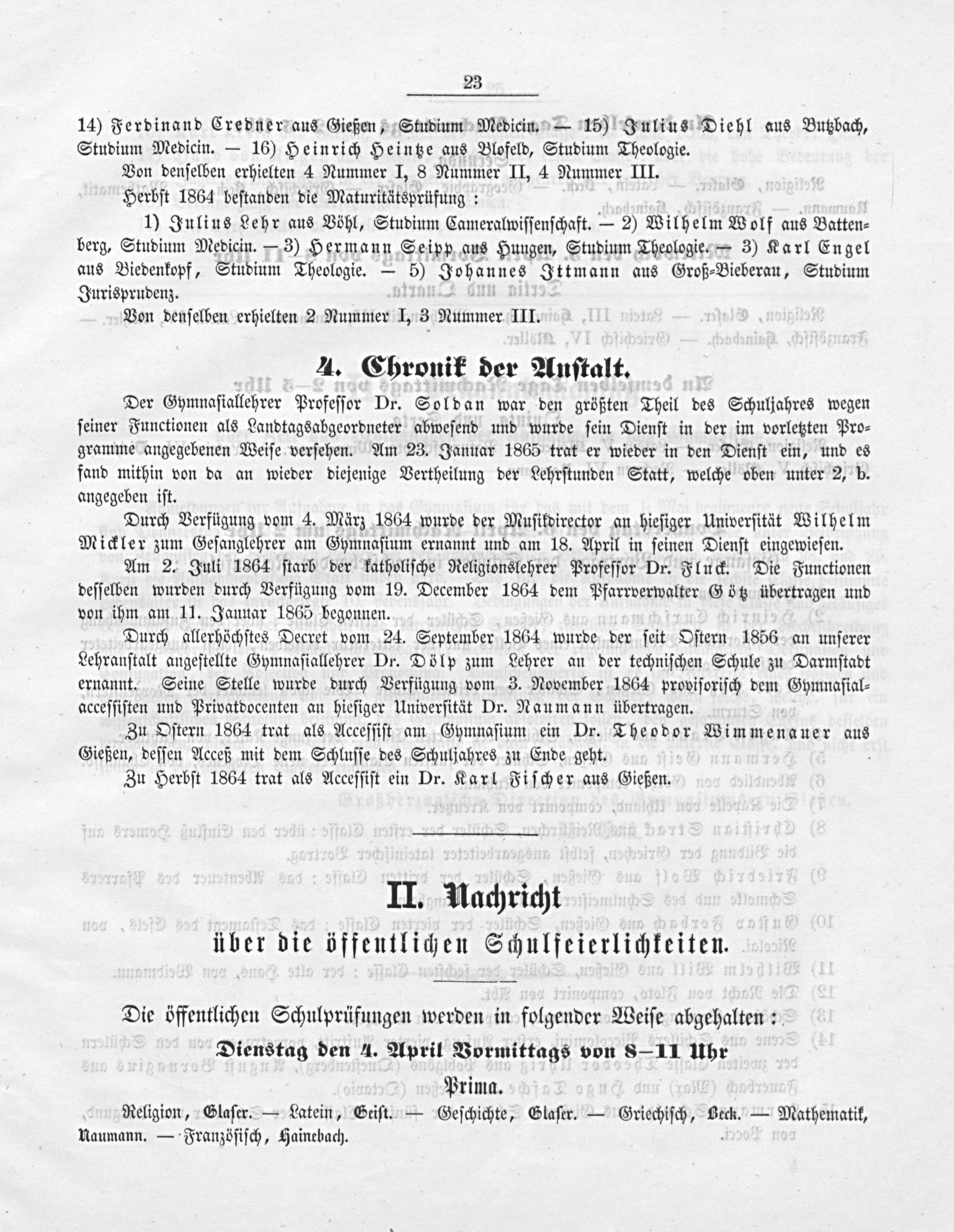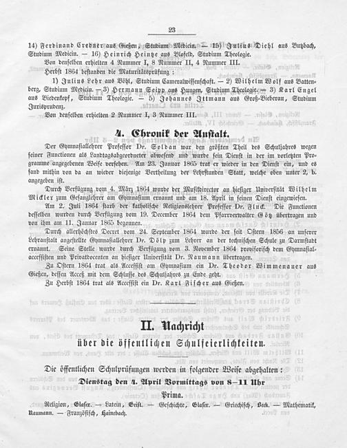 Zu Oſtern 1864 trat als Acceſſiſt am Gymnaſium ein Dr. Theodor Wimmenaner aus Gießen, deſſen Acceß mit dem Schluſſe des Schuljahres zu Ende geht.