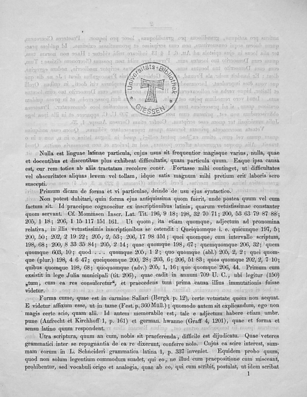 Nulla est linguae latinae particula, cujus usus sit frequentior magisque varius, nulla, quae et docentibus et discentibus plus exhibeat difficultatis, quam particula quum. Eaque ipsa causa est, cur rem toties ab aliis tractatam recolere coner. Fortasse mihi continget, ut difficultates vel obscuritates aliquas levem vel tollam, idque satis magnum mihi pretium erit laboris sero suscepti. Primum dicam de formna et vi particulae, deinde de usu ejus syntactico.