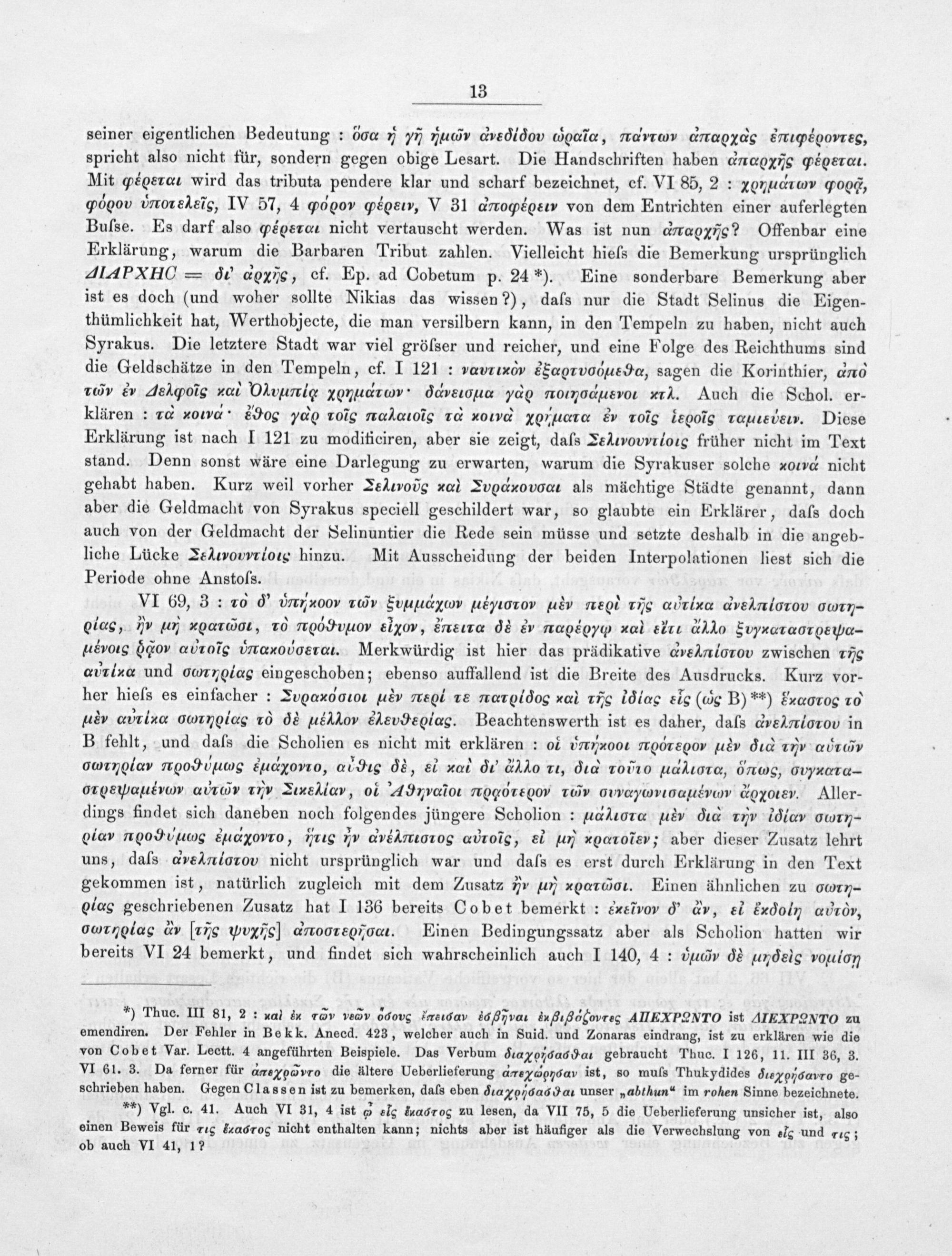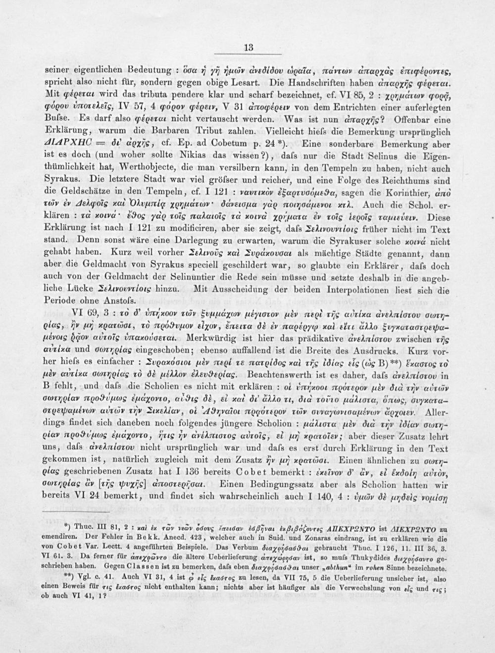 seiner eigentlichen Bedeutung: öGœ ν ł*ν*1εααυοιν deνε ddο α‿‿εοασe, roν daoον ειρσεοοvreg, spricht also nicht für, sondern gegen obige Lesart. Die Handschriften haben dππσ gégera. Mit eéOeraz wird das tributa pendere klar und scharf bezeichnet, cf. VI 85, 2: xxννιαεινs—αο⁶ς, qGοu dnorsleio, IV 57, 4 G⁶ν%ꝗ †‿έωοασιμν V 31 dmποꝓσέοειιν von dem Entrichten einer auferlegten Buſse. Es darf also †éosraz nicht vertauscht werden. Was ist nun dmπαοωxνQmπ⁹σο Offenbar eine Erklärung, warum die Barbaren Tribut zahlen. Vielleicht hieſs die Bemerkung ursprünglich IlAPXHO= dt'j doxic, cf. Ep. ad Cobetum p. 24*). Eine sonderbare Bemerkung aber ist es doch(und woher sollte Nikias das wissen?), dals nur die Stadt Selinus die Eigen- thümlichkeit hat, Werthobjecte, die man versilbern kann, in den Tempeln zu haben, nicht auch Syrakus. Die letztere Stadt war viel grölser und reicher, und eine Folge des Reichthums sind die Geldschätze in den Tempeln, cf. I 121:„æuτειινν εεμαρε υο⁴ε α, sagen die Korinthier, dmπ⁶ r6ν ε&ν eaꝓoies ui OAuεα xuεααεαινε deνεέιασιαα„⁴αο πνιπἀ⁵εμο qετd. Auch die Schol. er- klären: zd*ουά⁴· εοο„⁴α˙ο rOες ααα⁴αος τ⁴ oανα xονμαα εν rog ieooe 1αιεειινν. Diese Erklärung ist nach I 121 zu modificiren, aber sie zeigt, daſs NeAενονυντα⁶οιςα früher nicht im Text stand. Denn sonst wäre eine Darlegung zu erwarten, warum die Syrakuser solche*οινν⁴ nicht gehabt haben. Kurz weil vorher Xlινοσνοσ*νπα ευοeονσα als mächtige Städte genannt, dann aber die Geldmacht von Syrakus speciell geschildert war, so glaubte ein Erklärer, daſs doch auch von der Geldmacht der Selinuntier die Rede sein müsse und setzte deshalb in die angeb- liche Lücke NXeAwνwerlotg hinzu. Mit Ausscheidung der beiden Interpolationen liest sich die Periode ohne Anstoſs.