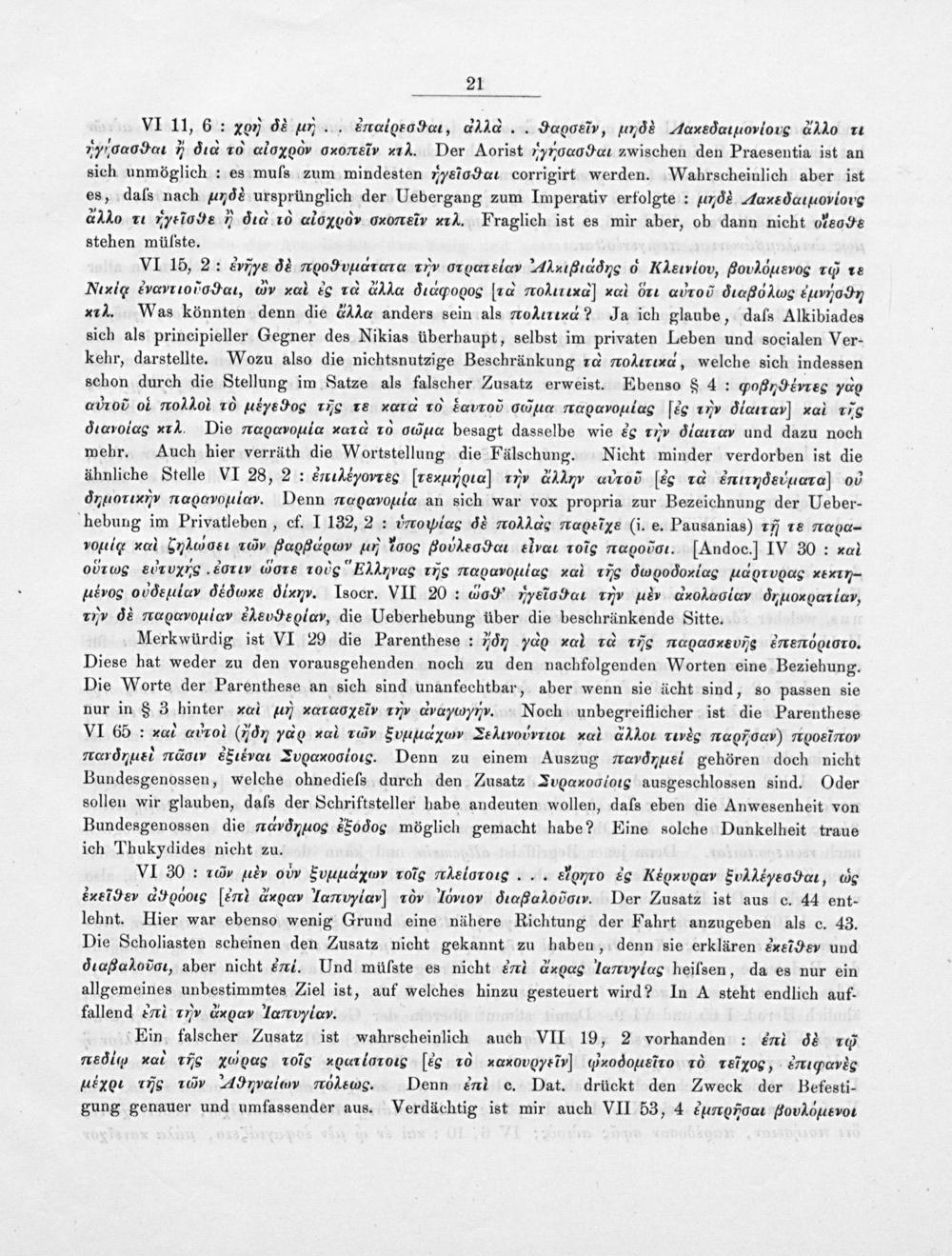 Merkwürdig ist VI 29 die Parenthese: ⁴„do zal 1d ic αοασεου* εεααιmρά⁶εσσστο. Diese hat weder zu den vorausgehenden noch zu den nachfolgenden Worten eine Beziehung. Die Worte der Parenthese an sich sind unanfechtbar, aber wenn sie ächt sind, so passen sie nur in§ 3 hinter xœ ⁴αάν καάτασενν ετν dνακeυνꝓν Noch unbegreiflicher ist die Parenthese VI 65:*2α ααο¹(⁶ αςος α ꝛυυν νυιιμ⁴eεασν Nεινοωιντιι α ³οι ν* T.αοσισσ οοασεmQέο Tα⁶eεάμεε πυέαοαυν sε⁴εμιένσαι τυννιυαάσνοο⁵οααα Denn zu einem Auszug TTœν⁴, ⸗με gehören doch nicht Bundesgenossen, welche ohnedieſs durch den Zusatz Juoοœααοαioες ausgeschlossen sind. Oder sollen wir glauben, daſs der Schriftsteller habe andeuten wollen, daſs eben die Anwesenheit von Bundesgenossen die α⁴ε⁴ιeφάν&sodoc möglich gemacht habe? Eine solche Dunkelheit traue ich Thukydides nicht zu.