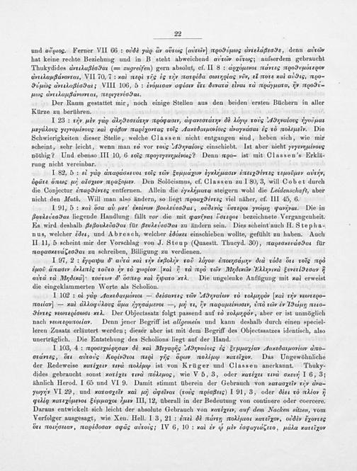 I 23: 1* ⁴αμην„⁴αο υνινεοατ⁴eτμmφνι ετοꝓρσσεꝛν, d—æννεοττνν ε d ro αονννναουε Syoονα usydau viννοαμένονσ νκαα σαsεονπασαεοεέαwꝛꝛ 0 Aarsdιμον⁶οςσ ναάρdmoσ²εςα πdενα. Die Schwierigkeiten dieser Stelle, welche Classen nicht entgangen sind, heben sich, wie mir scheint, sehr leicht, wenn man 10 vor r⁄ Aoνναdoug einschiebt. Ist aber nicht„epevnα‿‿eε̈uνe nöthig? Und ebenso III 10, 6 z⁰ οoyeyerενι Denn πο- ist mit Classen's Erklä- rung nicht vereinbar.
