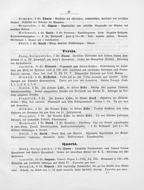 Mathematik, 4 St. Rauſch: 2 St. Geometrie: Einleitung. Lage von Graden gegeneinander in einer Ebene. Dreieck. Parallelogramm. Conſtructionsaufgaben.— 2 St. Arithmetik: Heis§ 1—25. Einfache Gleichungen 1. Grades.