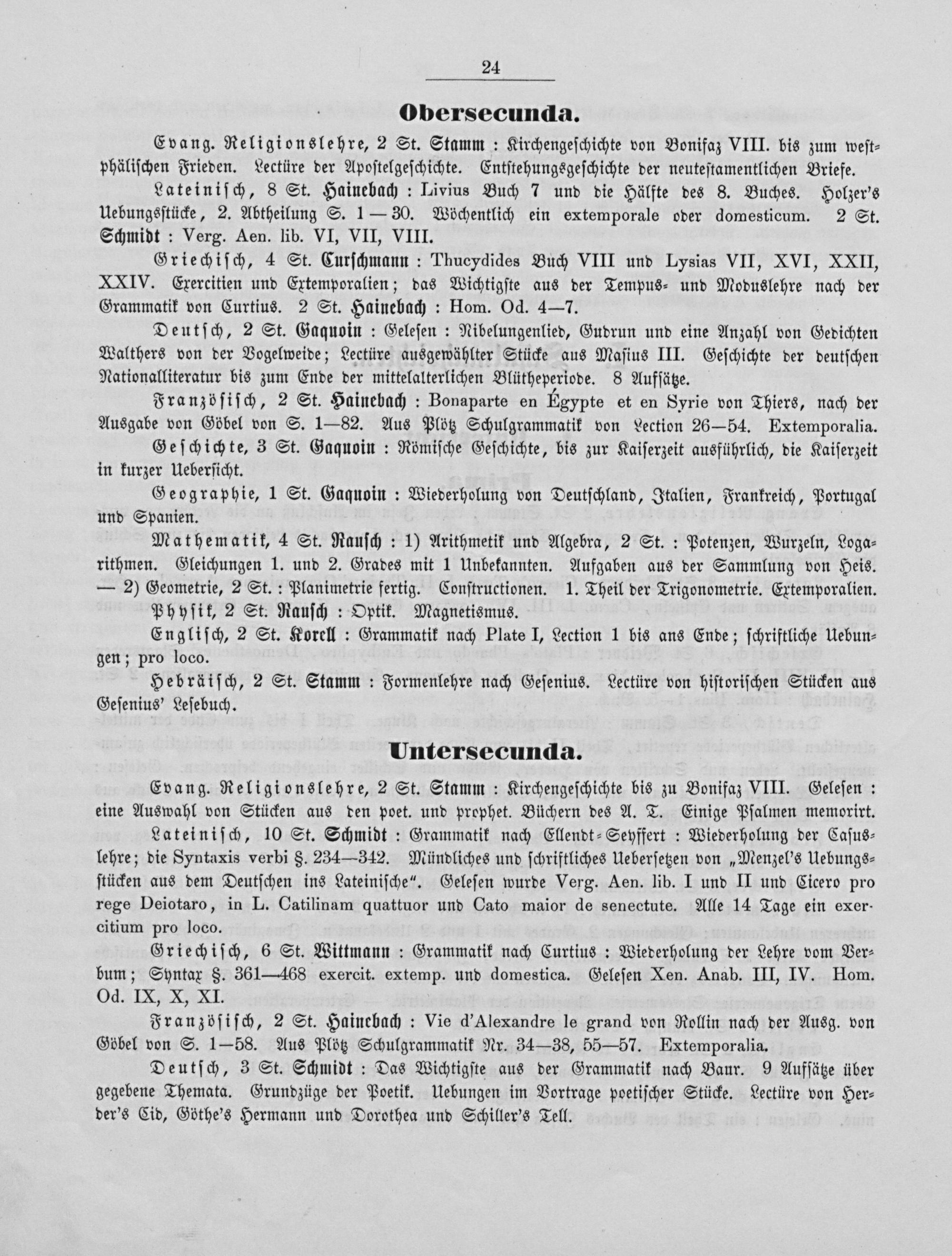 Lateiniſch, 8 St. Hainebach: Livius Buch 7 und die Hälfte des 8. Buches. Holzer's Uebungsſtücke, 2. Abtheilung S. 1— 30. Wöchentlich ein extemporale oder domesticum. 2 St. Schmidt: Verg. Aen. lib. VI, VII, VIII.
