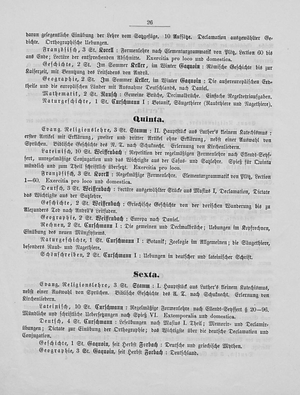 Lateiniſch, 10 St. Weiffenbach: Repetition der regelmäßigen Formenlehre nach Ellendt⸗Seyf⸗ fert, unregelmäßige Conjugation und das Wichtigſte aus der Caſus⸗ und Satllehre. Spieß für Quinta mündlich und zum Theil ſchriftlich überſetzt. Exercitia pro loco.
