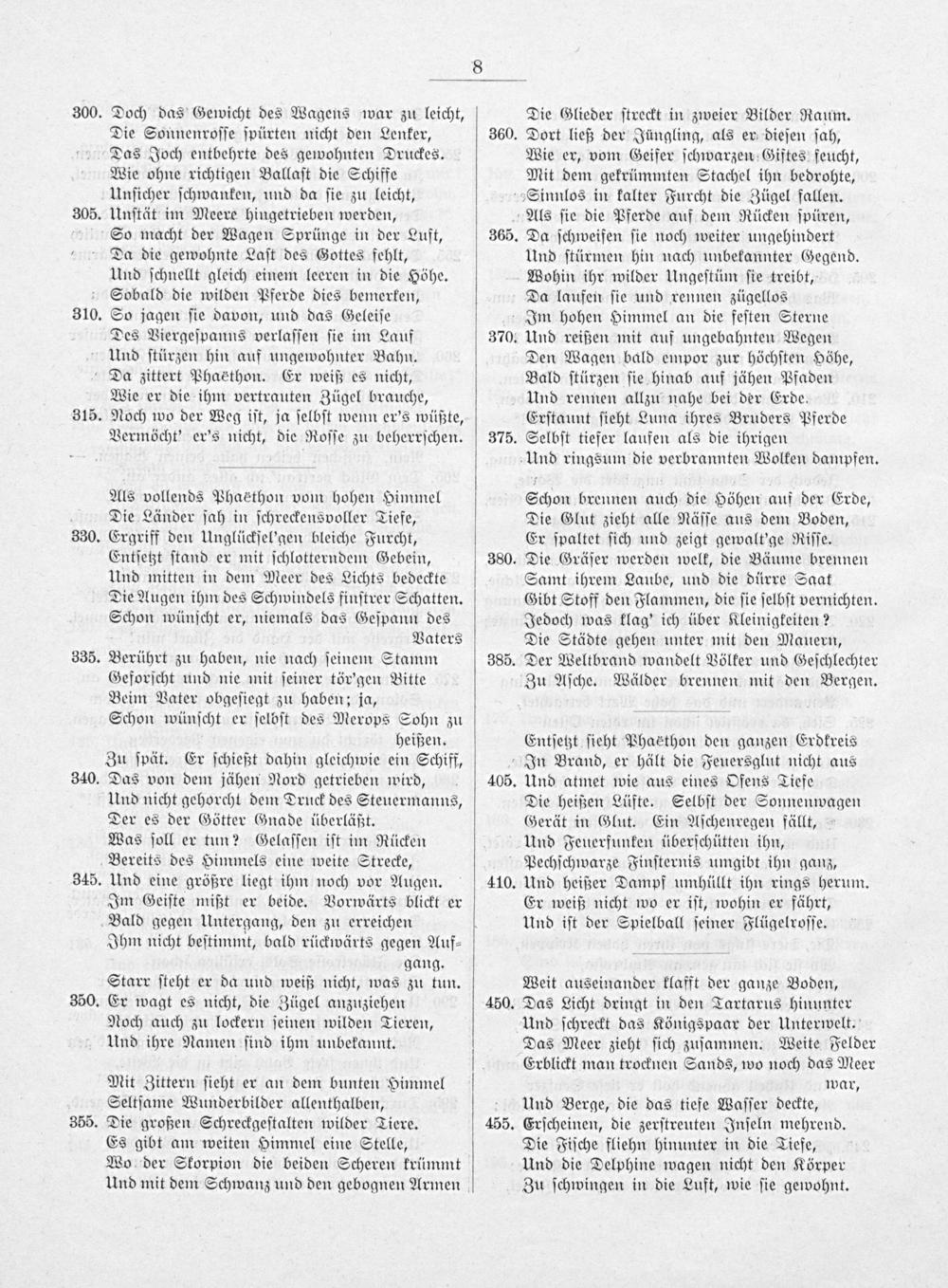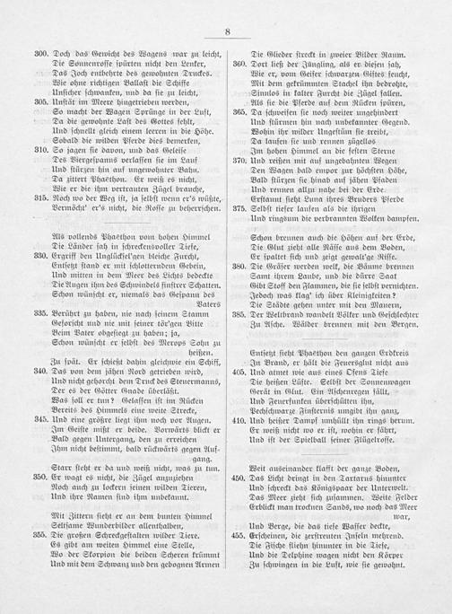 Im hohen Himmel an die feſten Sterne Und reißen mit auf ungebahnten Wegen Den Wagen bald empor zur höchſten Höhe, Bald ſtürzen ſie hinab auf jähen Pfaden Und rennen allzu nahe bei der Erde. Erſtaunt ſieht Luna ihres Bruders Pferde Selbſt tiefer laufen als die ihrigen