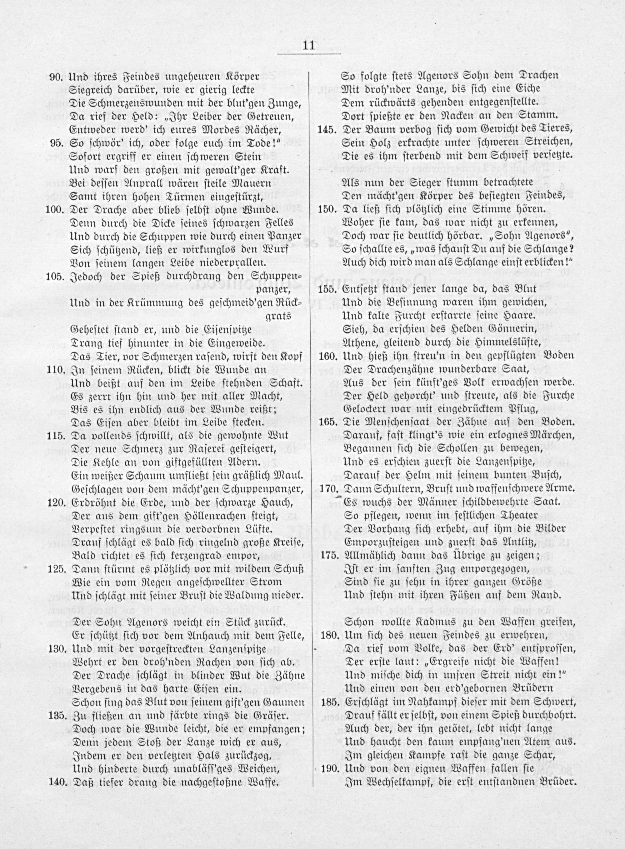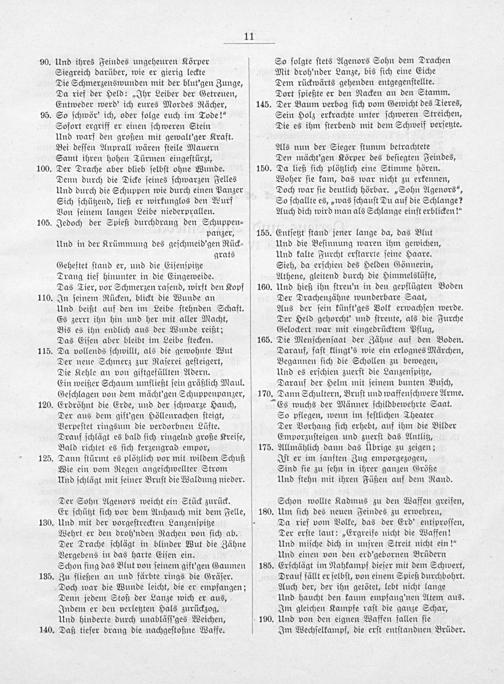 So folgte ſtets Agenors Sohn dem Drachen Mit droh'nder Lanze, bis ſich eine Eiche Dem rückwärts gehenden entgegenſtellte. Dort ſpießte er den Nacken an den Stamm.