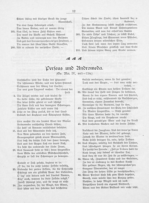 Den Arm gebunden an den harten Fels, Bewegungslos gleich einem Marmorbild, Nur daß die leichte Luft das Haar bewegte, Und aus den Augen floß ein laues Naß, Da faßt ihn unbewußt der Liebe Feuer, Und ſtaunend ſteht er ſtill; denn hingeriſſen Vom Bilde der erblickten Mädchenſchönheit, Vergißt er faſt die Schwingen zu bewegen.