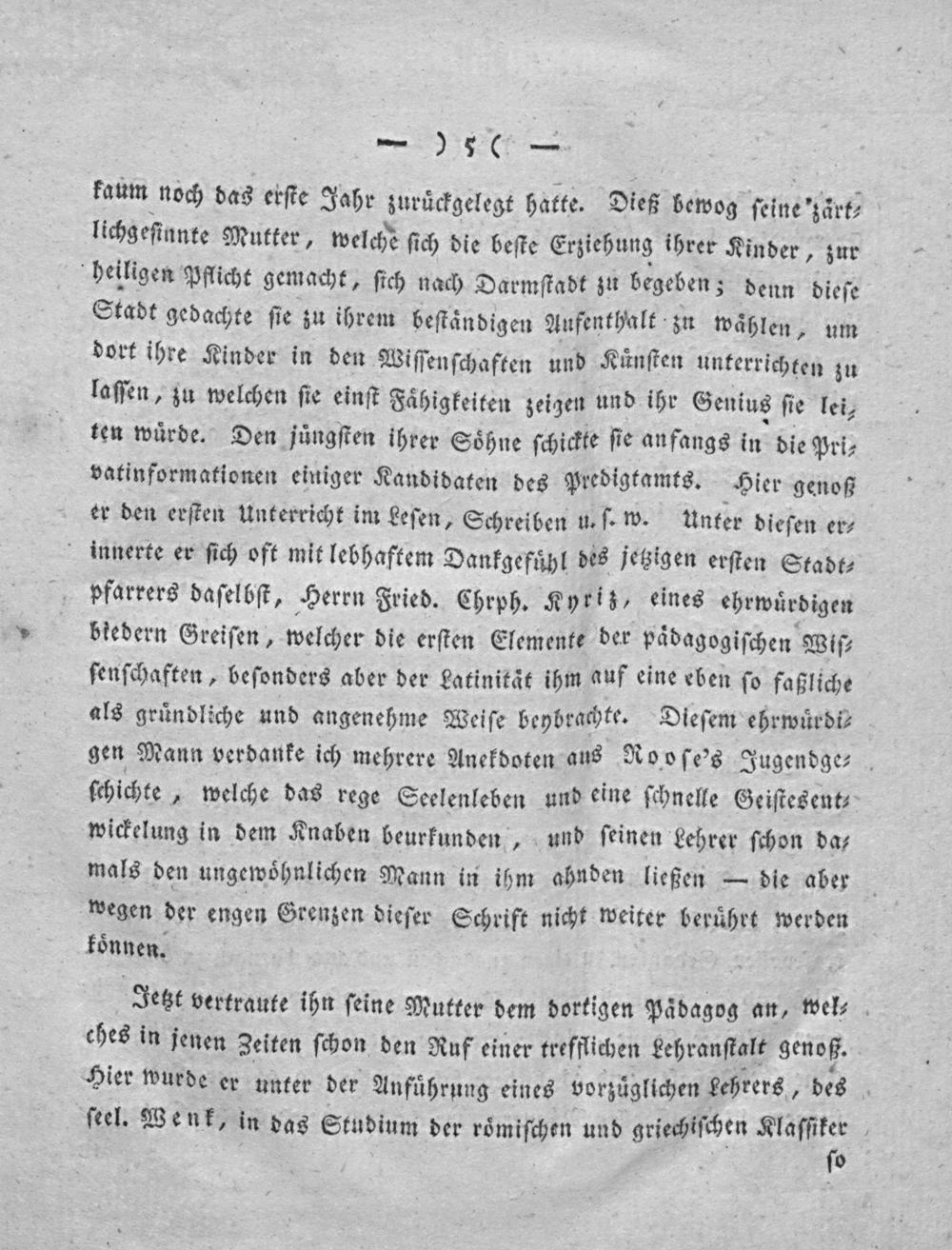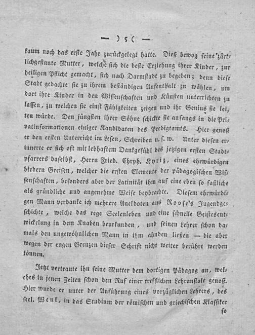 kaum noch das erſte Jahr zuruͤckgelegt hatte. Dieß bewog ſeine zaͤrt⸗ lichgeſinnte Mutter, welche ſich die beſte Erziehung ihrer Kinder, zur heiligen Pflicht gemacht, ſich nach Darmſtadt zu begeben; denn dieſe Stadt gedachte ſie zu ihrem beſtandigen Aufenthalt zu waͤhlen, um dort ihre Kinder in den Wiſſenſchaften und Kuͤnſten unterrichten zu laſſen, zu welchen ſie einſt Faͤhigkeiten zeigen und ihr Genius ſie lei, ten wuͤrde. Den juͤngſten ihrer Soͤhne ſchickte ſie anfangs in die Pri⸗ vatinformationen einiger Kandidaten des Predigtamts. Hier genoß er den erſten Unterricht im Leſen, Schreiben u. ſ- w. Unter dieſen er⸗ innerte er ſich oft mit lebhaftem Dankgefuͤhl des jetzigen erſten Stadt⸗ pfarrers daſelbſt, Herrn Fried. Chrph. Kyriz, eines ehrwuͤrdigen biedern Greiſen, welcher die erſten Elemente der paͤdagogiſchen Wiſ⸗ ſenſchaften, beſonders aber der Latinitaͤt ihm auf eine eben ſo faßliche als gruͤndliche und angenehme Weiſe beybrachte. Dieſem ehrwuͤrdi⸗ gen Mann verdanke ich mehrere Anekdoten aus Rooſe's Jugendge⸗ ſchichte„ welche das rege Seelenleben und eine ſchnelle Geiſtesent⸗ wickelung in dem Knaben beurkunden„ und ſeinen Lehrer ſchon da⸗ mals den ungewoͤhnlichen Mann in ihm ahnden ließen— die aber wegen der engen Grenzen dieſer Schrift nicht weiter beruͤhrt werden koͤnnen.