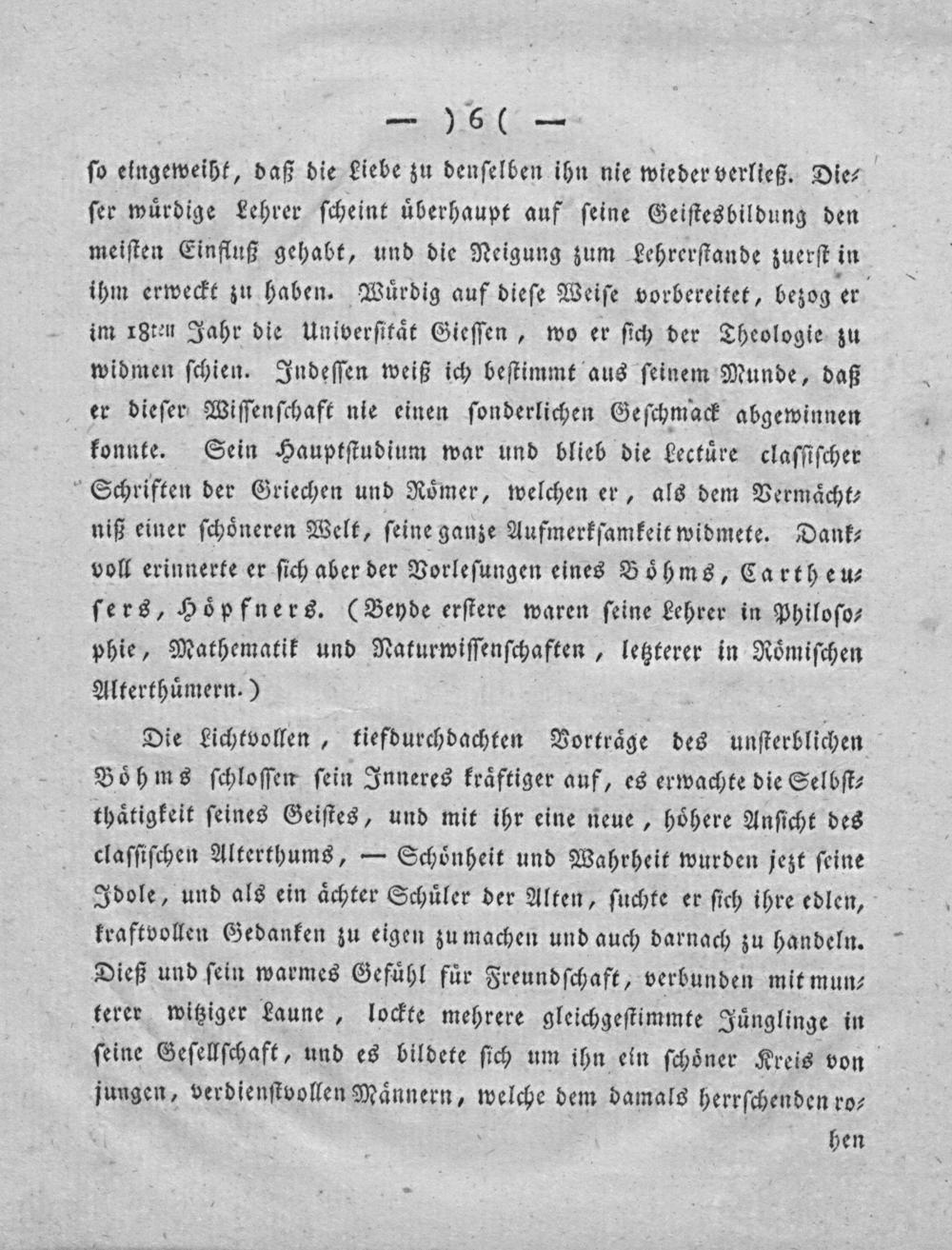 ſo eingeweiht, daß die Liebe zu denſelben ihn nie wieder verließ. Die⸗ ſer wuͤrdige Lehrer ſcheint uͤberhaupt auf ſeine Geiſtesbildung den meiſten Einfluß gehabt, und die Neigung zum Lehrerſtande zuerſt in ihm erweckt zu haben. Wuͤrdig auf dieſe Weiſe vorbereitet, bezog er im 18ten Jahr die Univerſitaͤt Gieſſen, wo er ſich der Theologie zu widmen ſchien. Indeſſen weiß ich beſtimmt aus ſeinem Munde, daß er dieſer Wiſſenſchaft nie einen ſonderlichen Geſchmack abgewinnen konnte. Sein Hauptſtudium war und blieb die kectuͤre claſſiſcher Schriften der Griechen und Roͤmer, welchen er, als dem Vermaͤcht⸗ niß einer ſchoͤneren Welt, ſeine ganze Aufmerkſamkeit widmete. Dank⸗ voll erinnerte er ſich aber der Vorleſungen eines Boͤhms, Cartheu⸗ ſers, Hoͤpfners.(Beyde erſtere waren ſeine behrer in Philoſo⸗ phie, Mathematik und Naturwiſſenſchaften ,letzterer in Roͤmiſchen Alterthuͤmern.)