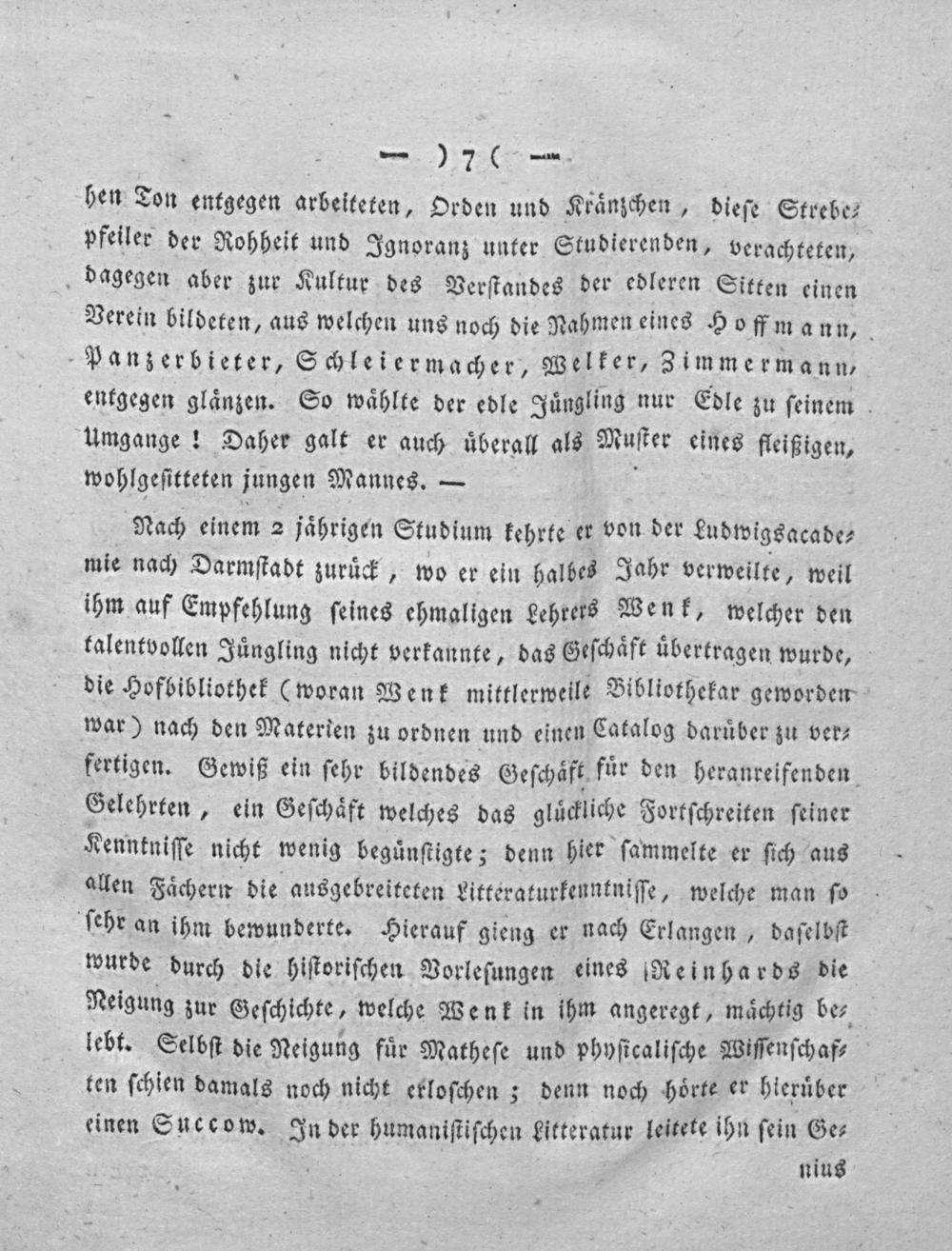 Nach einem 2 jaͤhrigen Studium kehrte er von der Ludwigsacade⸗ mie nach Darmſtadt zuruͤck, wo er ein halbes Jahr verweilte, weil ihm auf Empfehlung ſeines ehmaligen Lehrers Wenk, welcher den talentvollen Juͤngling nicht verkannte, das Geſchaͤft uͤbertragen wurde, die Hofbibliothek(woran Wenk mittlerweile Bibliothekar geworden war) nach den Materien zu ordnen und einen Catalog daruͤber zu ver⸗ fertigen. Gewiß ein ſehr bildendes Geſchaͤft fuͤr den heranreifenden Gelehrten, ein Geſchaͤft welches das gluͤckliche Fortſchreiten ſeiner Kenntniſſe nicht wenig beguͤnſtigte; denn hier ſammelte er ſich aus allen Faͤchern die ausgebreiteten Litteraturkenntniſſe, welche man ſo ſehr an ihm bewunderte. Hierauf gieng er nach Erlangen, daſelbſt wurde durch die hiſtoriſchen Vorleſungen eines Reinhards die Neigung zur Geſchichte, welche Wenk in ihm angeregt, maͤchtig be⸗ lebt. Selbſt die Neigung fuͤr Matheſe und phyſicaliſche Wiſſenſchaf⸗ ten ſchien damals noch nicht erloſchen; denn noch hoͤrte er hieruͤber einen Succow. In der humaniſtiſchen Litteratur leitete ihn ſein Ge⸗