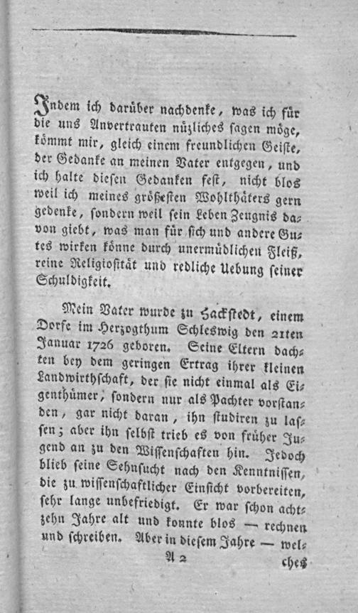 Mein Vater wurde zu Sackſtedt, einem Dorfe im Herzogthum Schleswig den auten Januar 1726 geboren. Seine Eltern dach⸗ ken bey dem geringen Ertrag ihrer kleinen Landwirthſchaft, der ſie nicht einmal als Ei⸗ genthuͤmer, ſondern nur als Pachter vorſtan⸗ den, gar nicht daran„ihn ſtudiren zu laſ⸗ ſen; aber ihn ſelbſt trieb es von fruͤher Ju⸗ gend an zu den Wiſfenſchaften hin. Jedoch blieb ſeine Sehnſucht nach den Kenntniſſen, die zu wiſſenſchaftlicher Einſicht vorbereiten, ſehr lange unbefriedigt. Er war ſchon acht⸗ zehn Jahre alt und konnte blos— rechnen und ſchreiben. Aber in dieſem Jahre— wel⸗