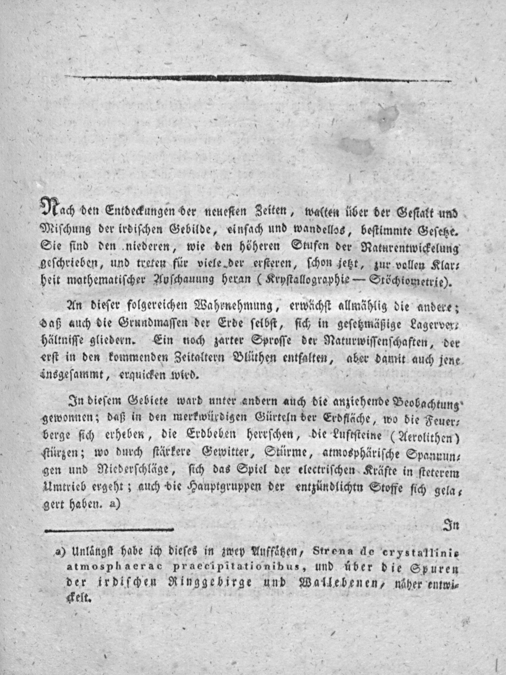 Nach den Entdeckungen der neueſten Zeiten, walten über der Geſtalt und Miiſchung der irdiſchen Gebilde, einſach und wandellos, beſtimmte Geſetze. Sie ſind den niederen, wie den höheren Stufen der Raturentwickelung geſchrieben, und treten für viele der erſteren, ſchon jetzt, zur vollen Klar⸗ heit mathematiſcher Auſchauung heran(Kryſtallographie— Sröchiometrie).
