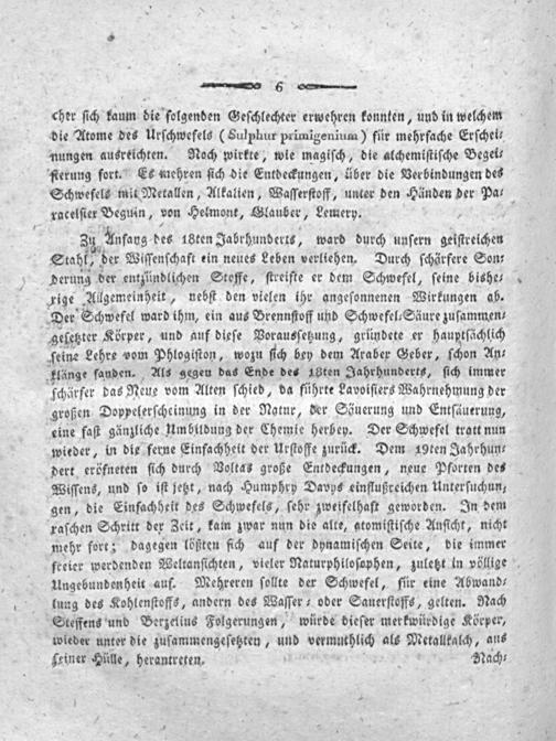 35 Anfaug des 18ten Jabrhunderts, ward durch unſern giſteichen Stahl, der Wiſſenſchaft ein neues Leben verliehen. Durch ſchärfere Son⸗ derung der entzündlichen Stoffe, ſtreifte er dem Schwefel, ſeine bishe⸗ gige Allgemeinheit, nebſt den vielen ihr angeſonnenen Wirkungen ab. Der Schwefel ward ihm, ein aus Brennſtoff und Schwefel⸗Säure zuſammen⸗ geſetzter Körper, und auf dieſe Vorausſetzung, gründete er hauptſächlich ſeine Lehre vom Phlogiſton, wozu ſi ſich bey dem Araber Geber, ſchon An⸗ klänge fanden. Als segen das Ende des 18ten Jahrhunderts, ſich immer ſchärfer das Neue vom Alten ſchied, da führte Lavoiſiers Wahrnehmung der großen Doppelerſcheinung in der Natur, der Säuerung und Entſäuerung, eine faſt gänzliche Umbildung der Chemie herbey. Der Schwefel tratt nun wieder, in die ferne Einfachheit der Urſtoffe zurück. Dem 19ten Jahrhun⸗ dert eröfneten ſich durch Voltas große Entdeckungen, neue Pforten des Wiſſens, und ſo iſt jetzt, nach Humphry Davys einflußreichen Unterſuchun, gen, die Einſachheit des Schwefels, ſehr zweifelhaft geworden. In dem raſchen Schritt der Zeit, kam zwar nun die alte, atomiſtiſche Anſicht, nicht mehr fort; dagegen lößten fich auf der dynamiſchen Seite, die immer