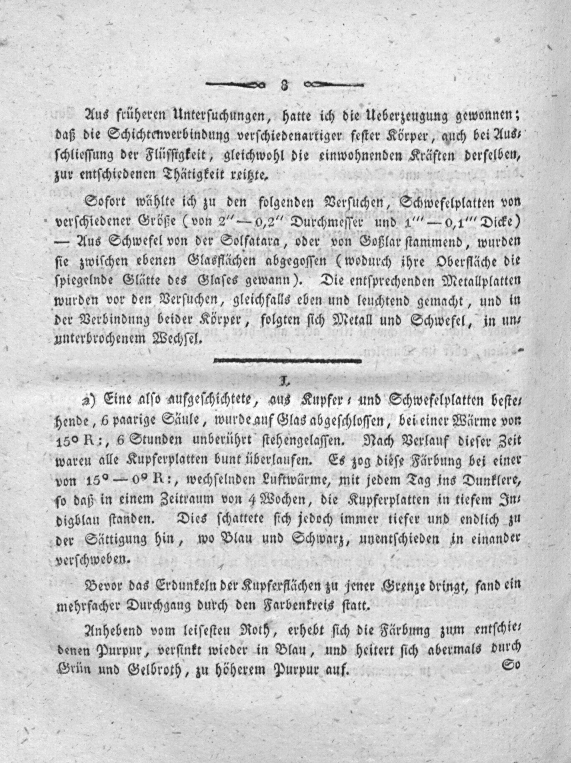 Soſfort wählte ich zu den folgenden Verſuchen, Schwefelplatten von verſchiedener Größe(von 2— 0,2“ Durchmeſſer und 1⁰1— 0,1“ Dicke) — Aus Schwefel von der Solfatara, oder von Goßlar ſtammend, wurden ſie zwiſchen ebenen Glasflächen abgegoſſen(wodurch ihre Oberſtäche die ſpiegelnde Glätte des Glaſes gewann). Die entſprechenden Metallplatten wurden vor den Verſuchen, gleichfalls eben und leuchtend gemacht, und in der Verbindung beider Körper, folgten ſich Metall und Schwefel, in un⸗ unterbrochenem Wechſe J.