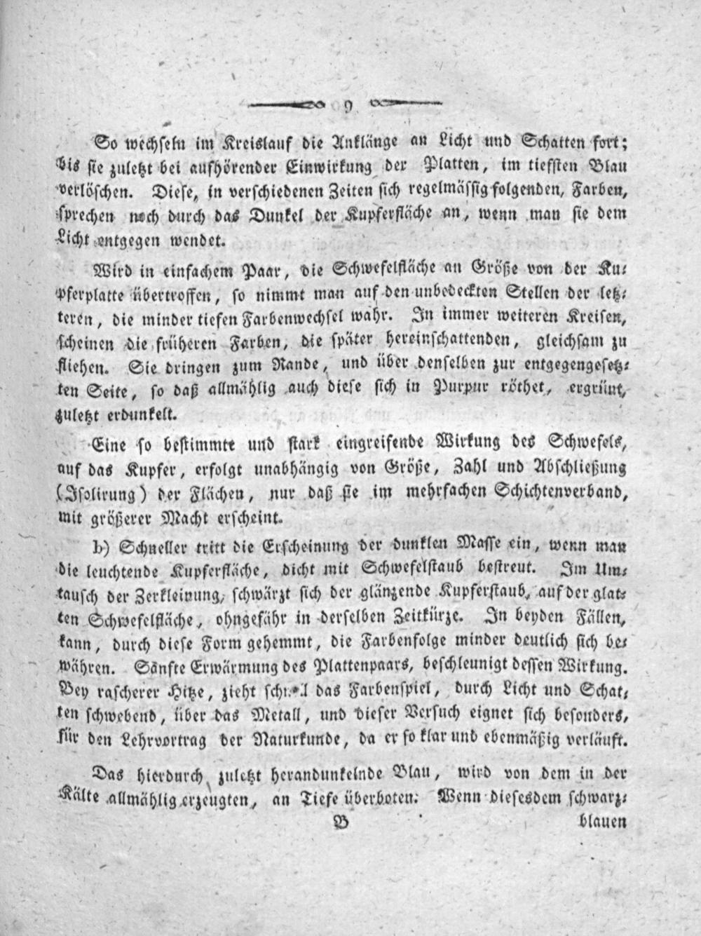 So wechſeln im Kreislauf die Anklänge an Licht und Schatten fort; bis ſie zuletzt bei aufhörender Einwirkung der Platten, im tiefſten Blau verlöſchen. Dieſe, in verſchiedenen Zeiten ſich regelmäſſig folgenden, Farben, ſprechen noch durch das Dunkel der Kupſerſche an, wenn man ſie dem Licht entgegen wendet.