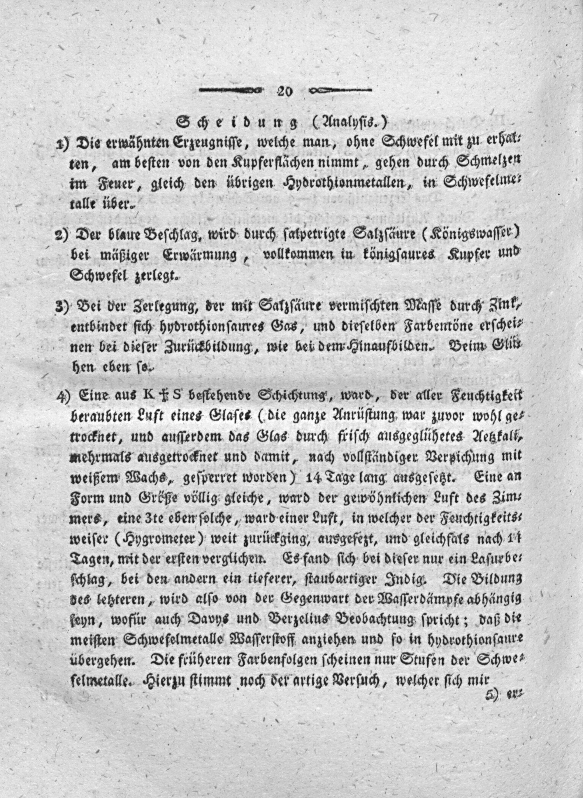4) Eine aus K † beſtehende Schichtung, ward, der aller Feuchtigkeit beraubten Luft eines Glaſes(die ganze Anrüſtung war zuvor wohl ge⸗ trocknet, und auſſerdem das Glas durch friſch ausgeglühetes Aetzkali⸗ mehrmals ausgetrocknet und damit, nach vollſtändiger Verpichung mit weißem Wachs, geſperret worden) 14 Tage lang ausgeſetzt. Eine an Form und Grüße völlig gleiche, ward der gewöhnlichen Luft des Zim⸗ mers, eine 3te eben ſolche, ward einer Luft, in welcher der Feuchtigkeits⸗ weiſer(Hygrometer) weit zurückging, ausgefezt, und gleichfals nach 11 Tagen, mit der erſten verglichen. Es fand ſich bei dieſer nur ein Laſurbe⸗ ſchlag, bei den andern ein tieferer, ſtaubartiger Indig. Die Bildung des letzteren, wird alſo von der Gegenwart der Waſſerdämpfe abhängig feyn, wofür auch Davys und Berzelius Beobachtung ſpricht; daß die meiſten Schwefelmetalle Waſſerſtoff anziehen und ſo in hydrothionſaure übergehen. Die früheren Farbenfolgen ſcheinen nur Stufen der Schwe⸗ felmetalle. Hierzu ſtimmt noch der artige Verſuch, welcher ſich mir