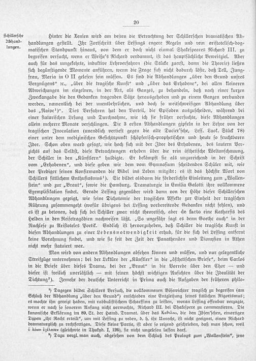 Man wird von andern Abhandlungen abſehen können und müſſen, und nur gelegentliche Streifzüge unternehmen: bei der Lektüre der„Künſtler“ in die„äſthetiſchen Briefe“, beim Carlos in die Briefe über dieſes Drama, bei der„Braut“ in die Vorrede über den Chor— und dieſer iſt freilich unerläßlich— mit ſeinen höchſt wichtigen Anſichten über die Idealität der Dichtung²). Jemehr der deutſche Unterricht in Prima auch die Aufgaben der früheren philo⸗